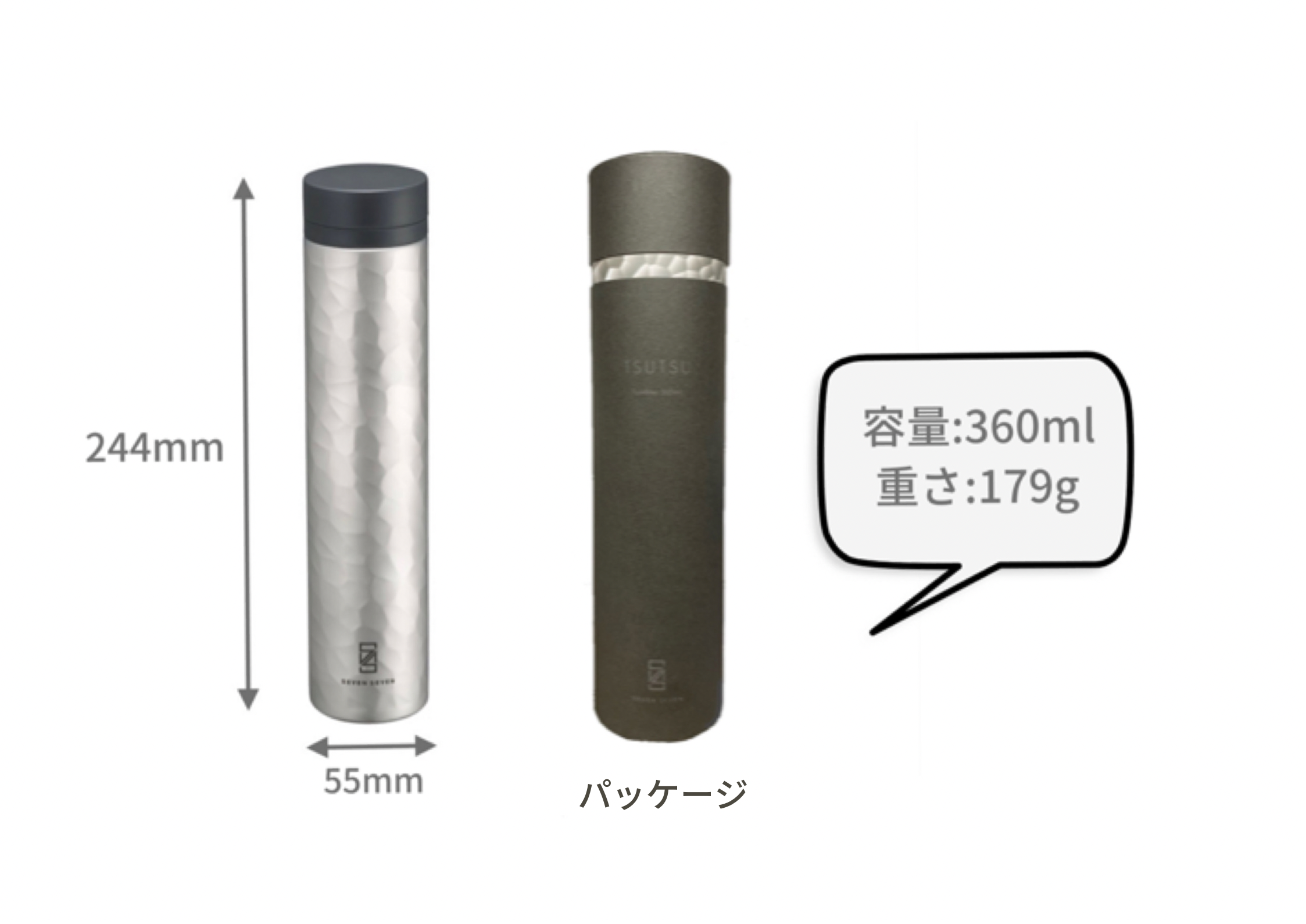 そんな思いから、この『TSUTSU Tumbler』は従来の水筒よりとても軽い!「179g」しかないんです!市販の同じ360mlの水筒では、200g前後のものが大半。容量・機能性を兼ね備え、さらに179gまで軽い水筒なんてそうそうありません。