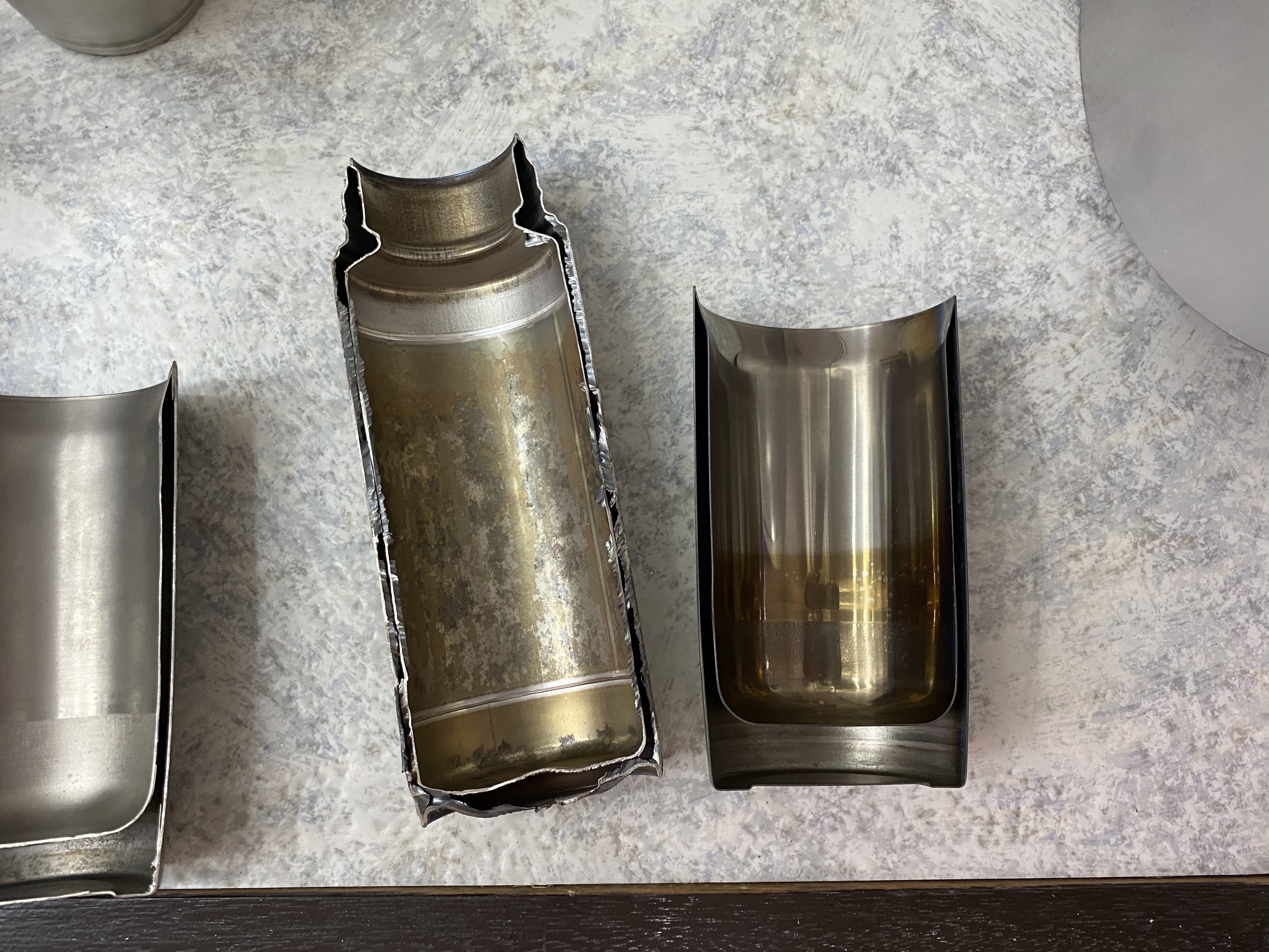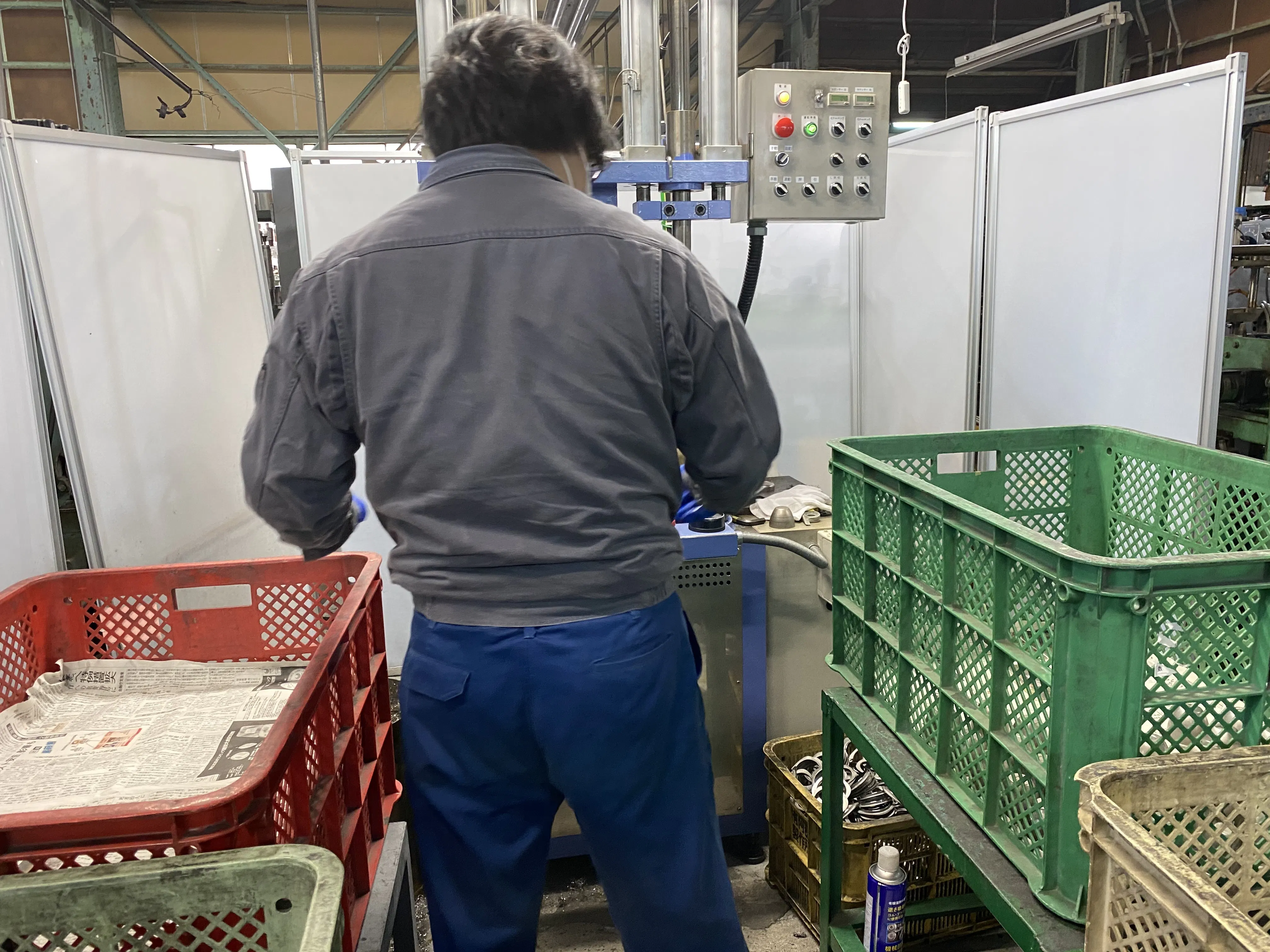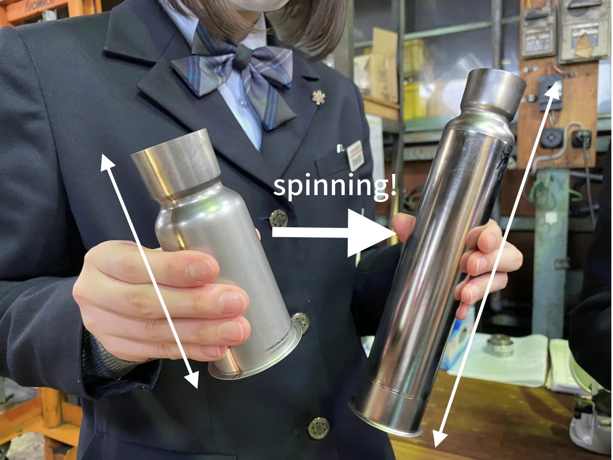 ではどのようにして、この軽量化を実現しているのか。SUSでは、ローラーで素材自体を引き伸ばす『スピニング』という技術で、0.3mmあった素材を最も薄い部分では0.08mmまで引き伸ばしています!これにより使用する素材の長さが通常の1/3で済み、重さもなんと約70gも軽くなるんです!