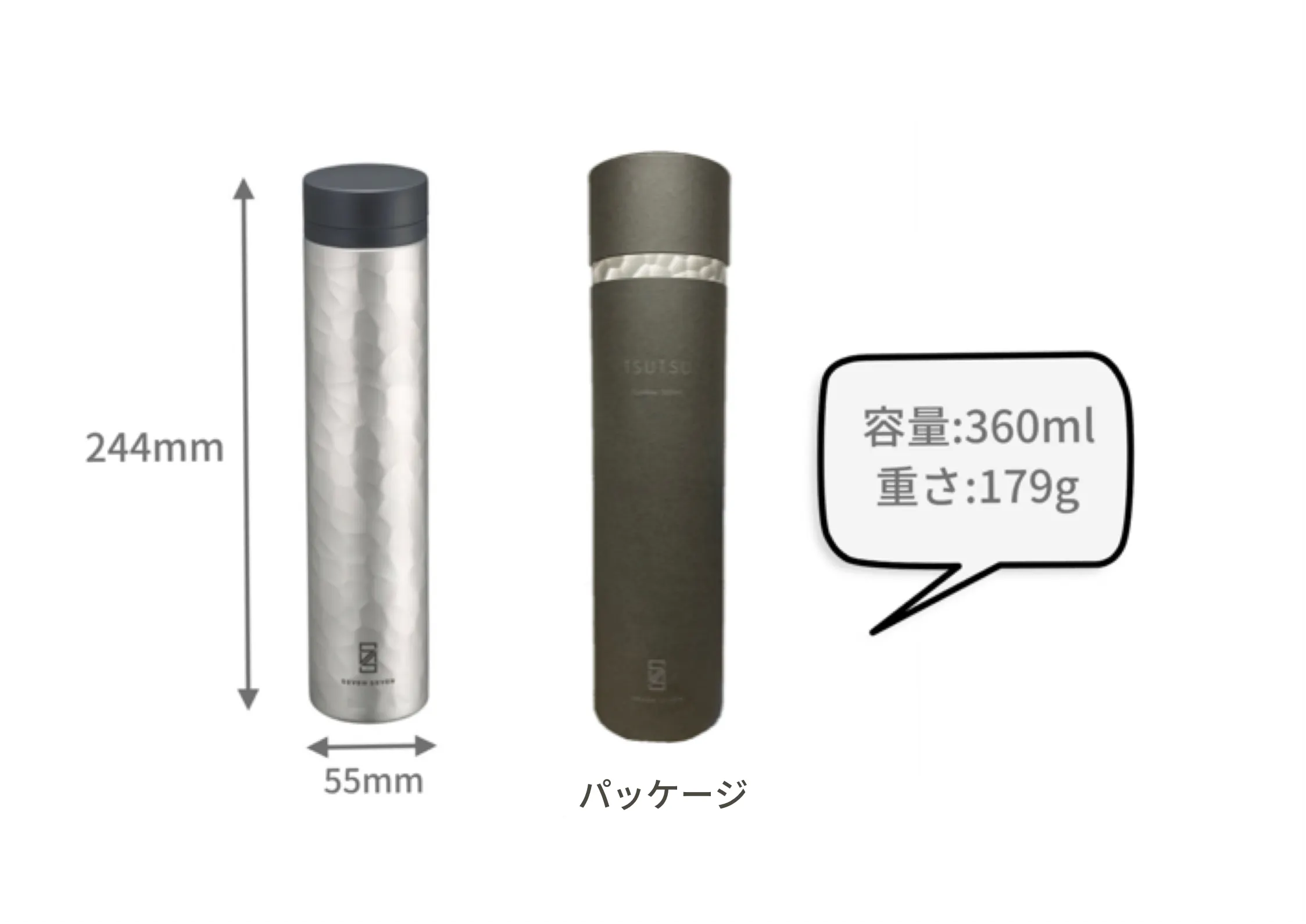 そんな思いから、この『TSUTSU Tumbler』は従来の水筒よりとても軽い!「179g」しかないんです!市販の同じ360mlの水筒では、200g前後のものが大半。容量・機能性を兼ね備え、さらに179gまで軽い水筒なんてそうそうありません。