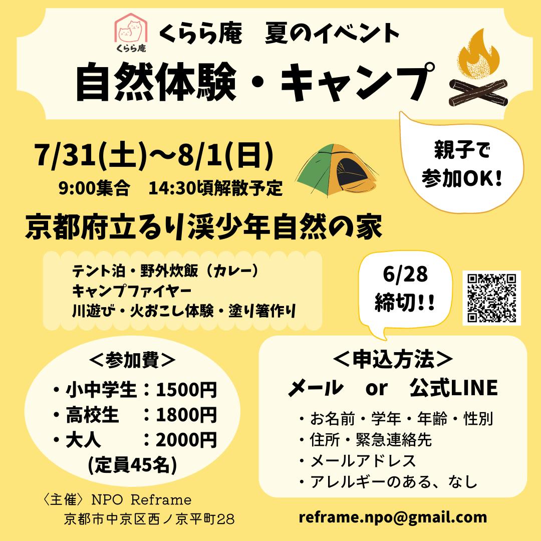 京都府るり渓少年自然の家にて、キャンプを行います。