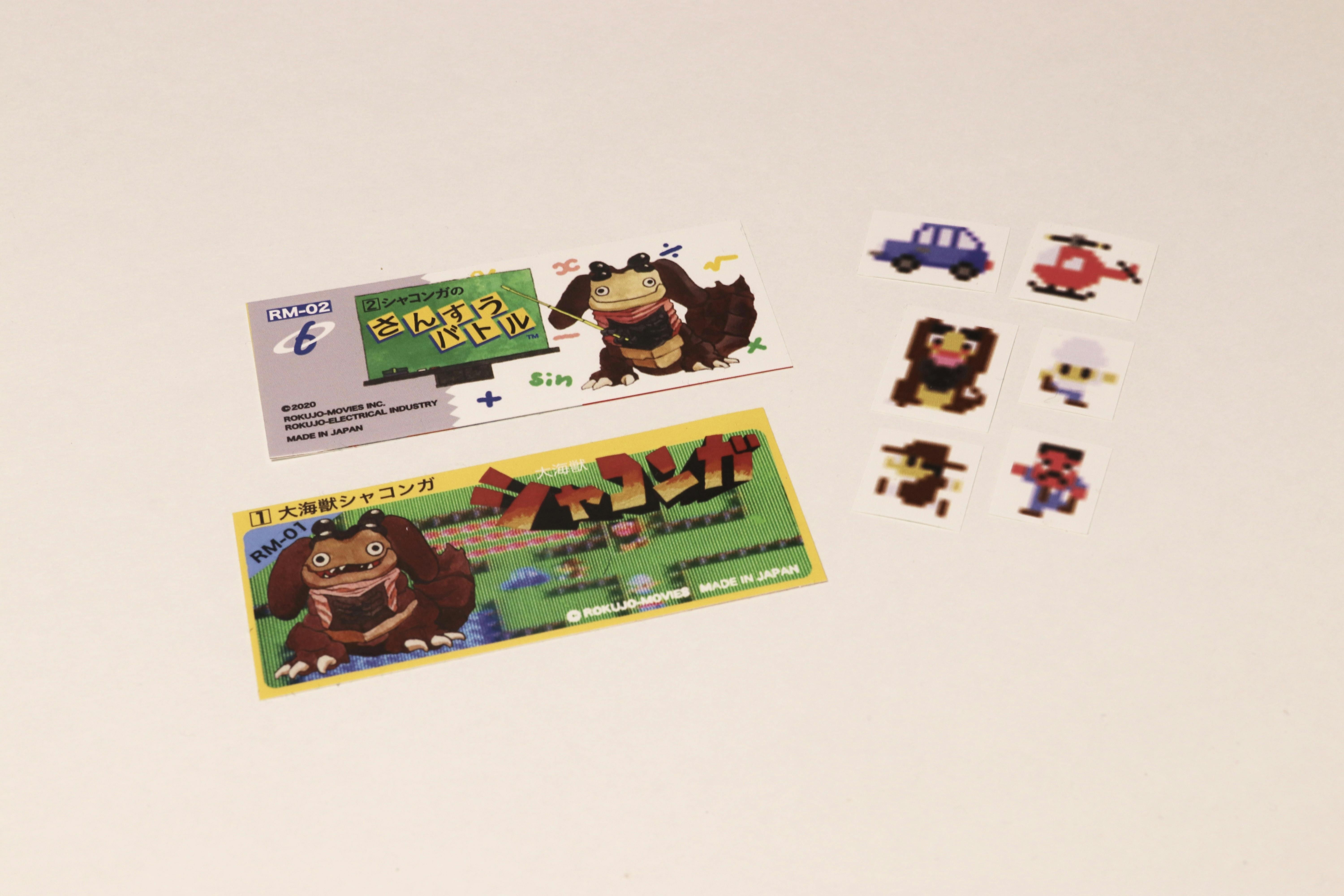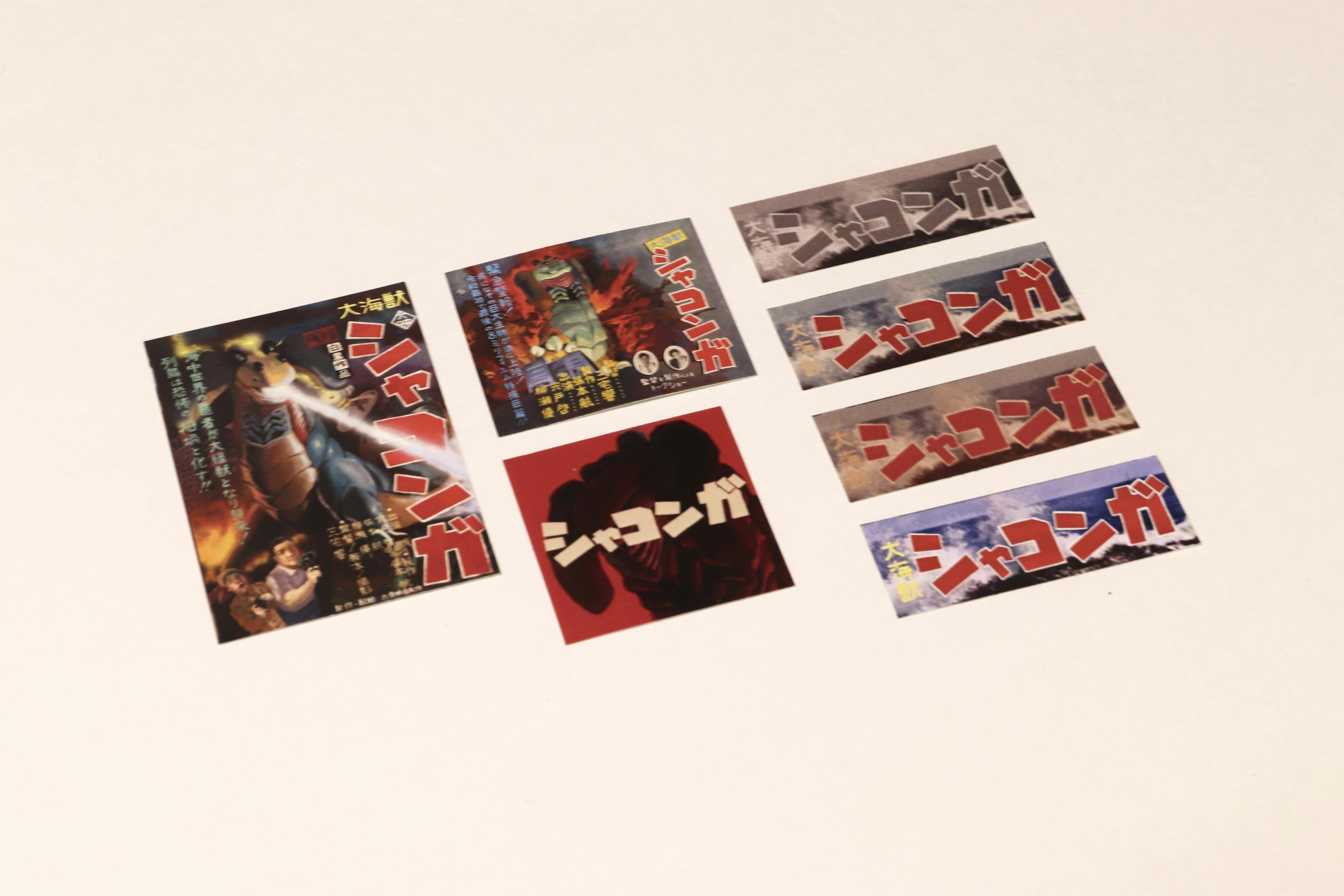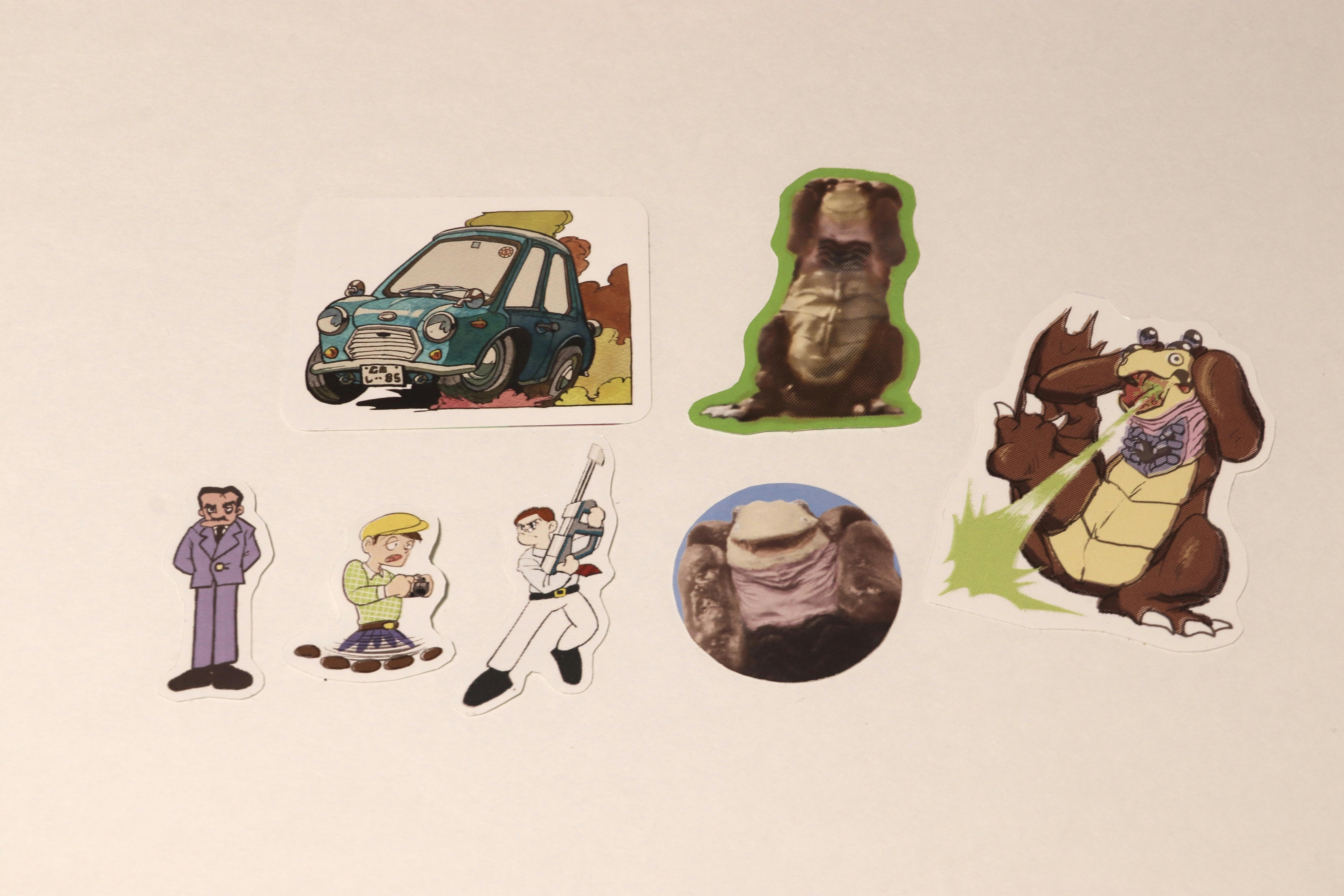 70年代のテレビ漫画風のイラストと、劇中のシャコンガを切り抜いてカラー化したステッカーです。