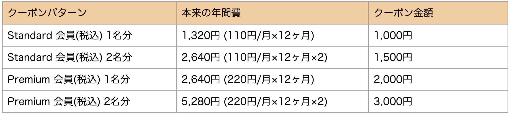 通常通り定期購入頂くパターンと、クーポンにおける年間費を確認できる早見表を以下に用意しました。