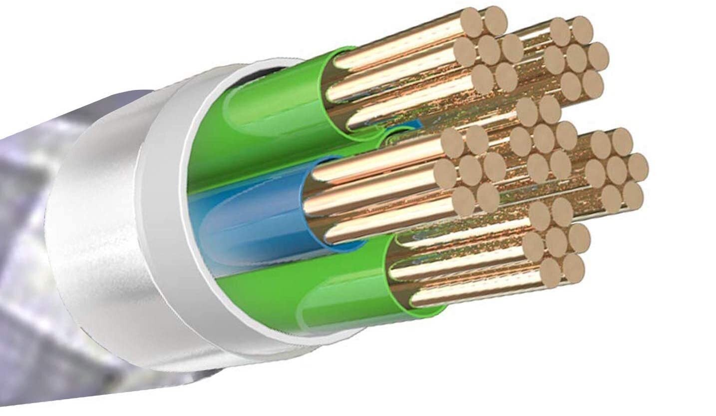 内部は1つ1つのワイヤーがポリ塩化ビニールで纏われた銅でできています。それが束になってケーブルを形成しています。そのケーブルにアルミ箔のレイヤーを巻き付けています。これはEMI(電磁波妨害)を防ぐためであり、このプロセスは規制で決められており、耐久性にも優れています。