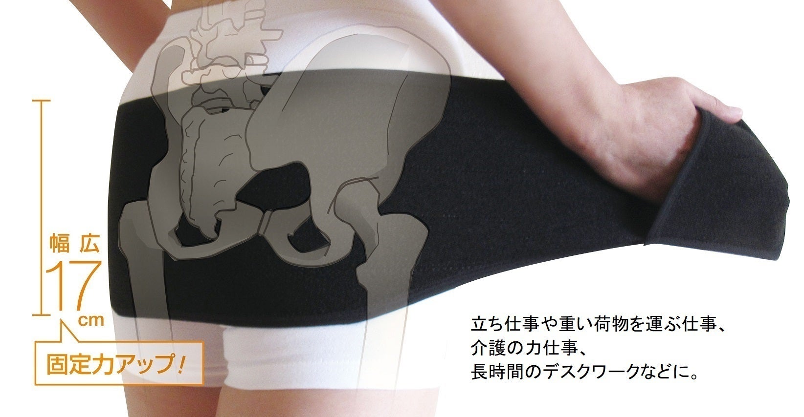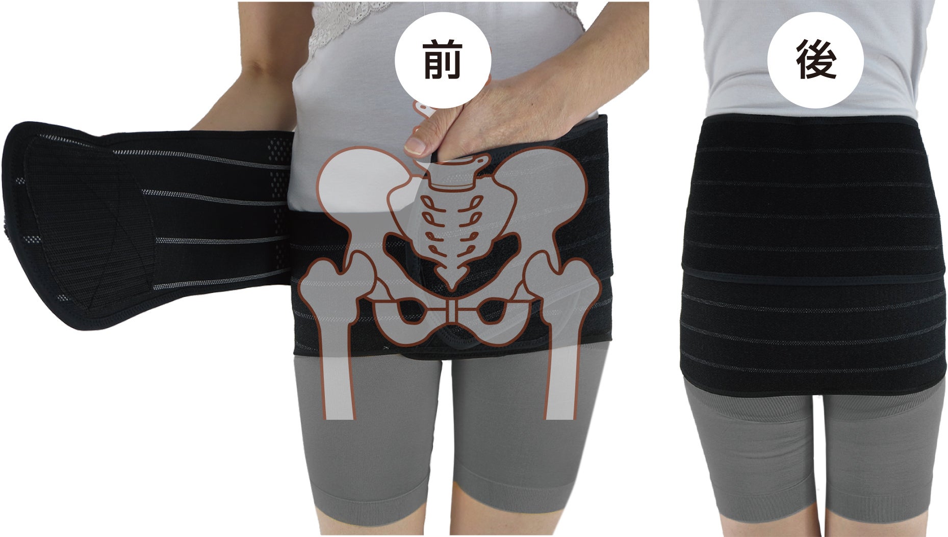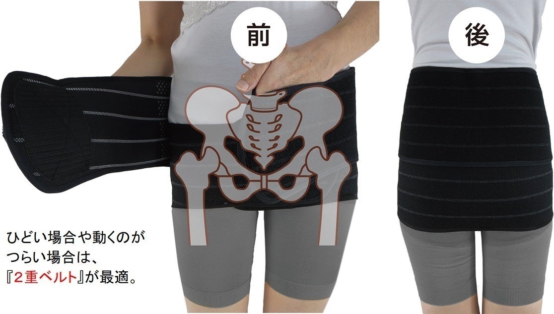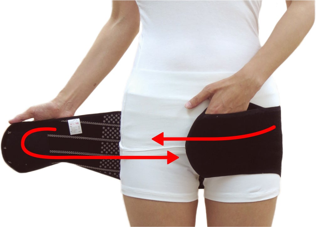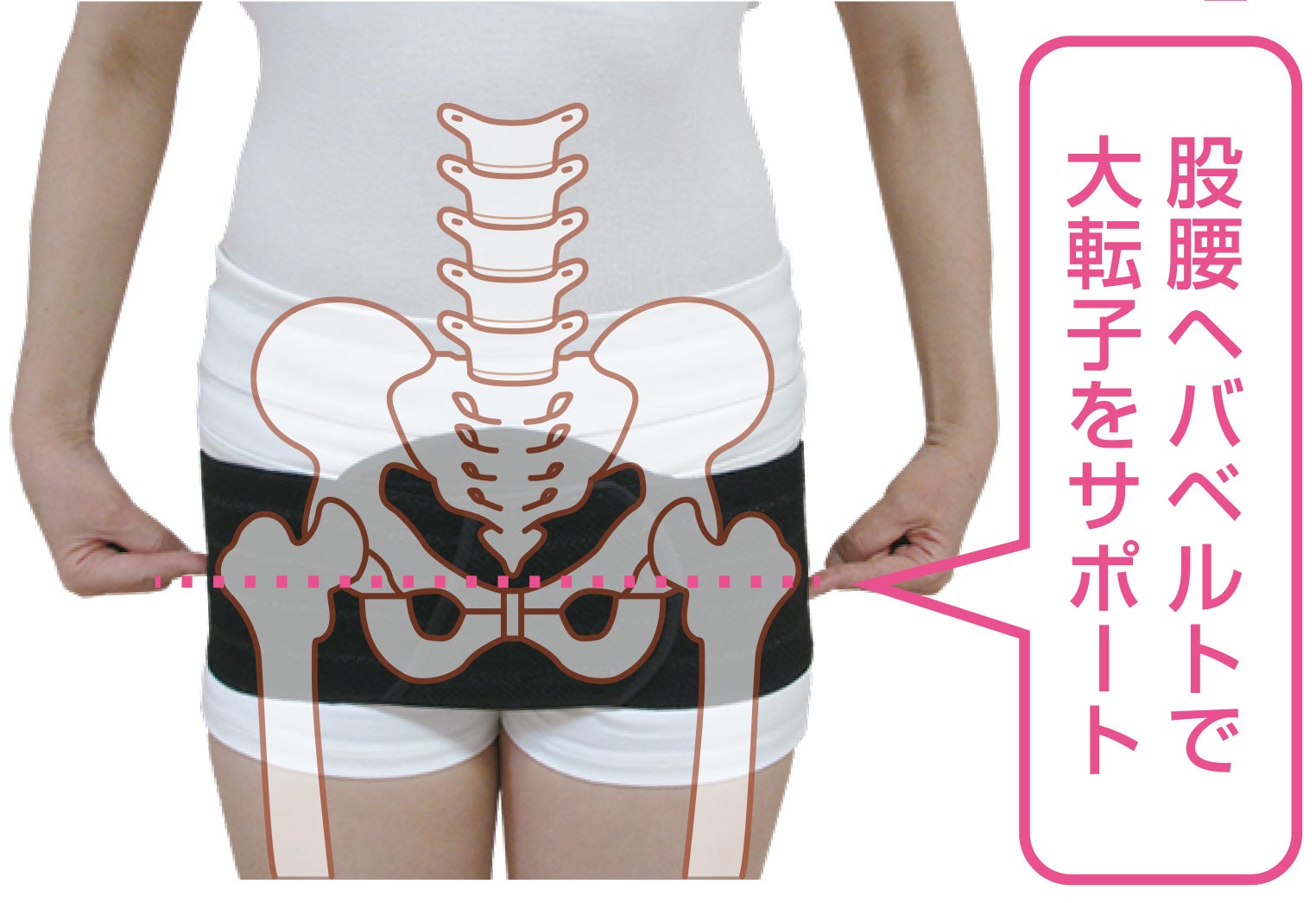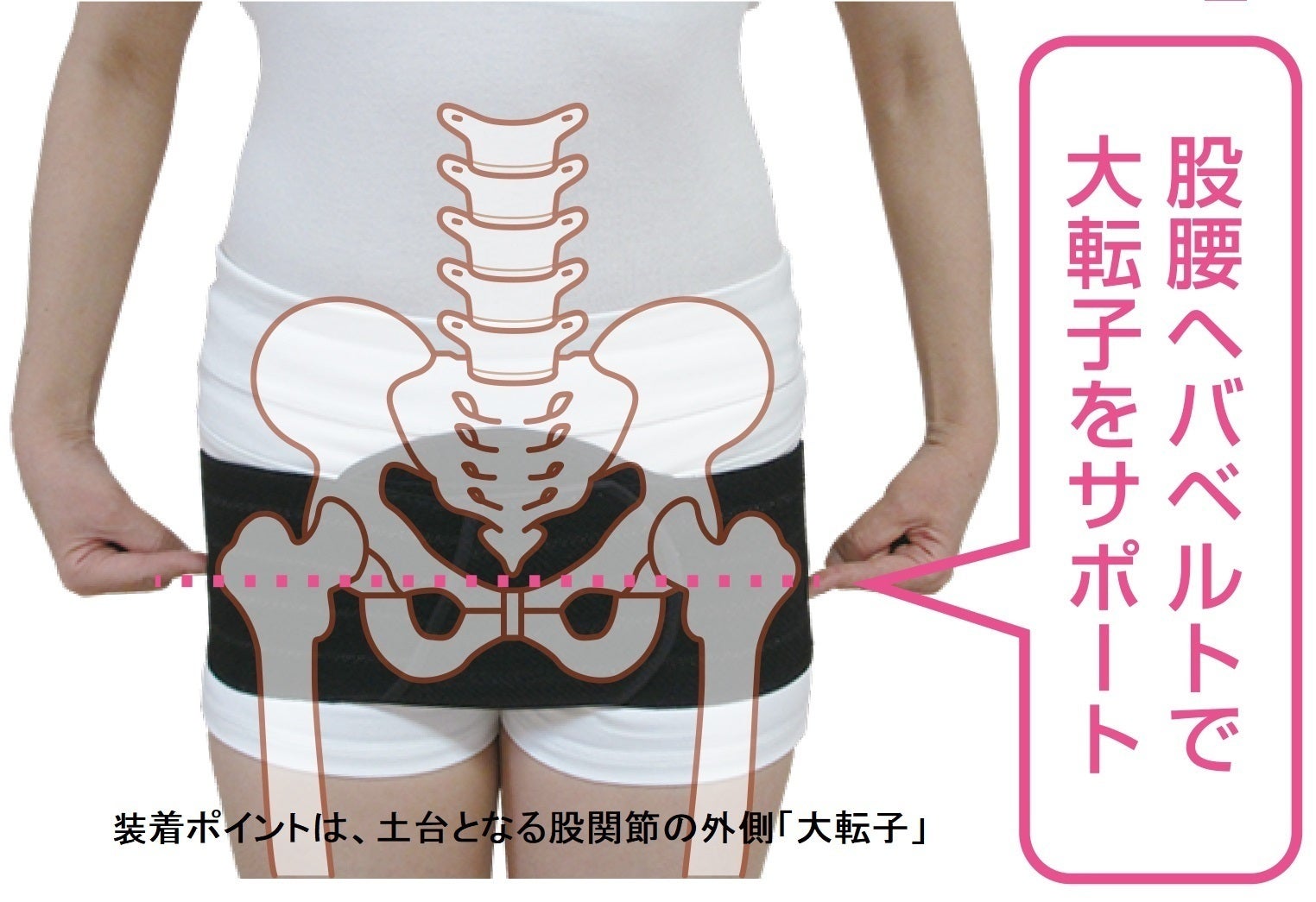 正しい装着ポイントは、左右の股関節の外側にある「大転子」の固定。その結果、骨盤とその上に乗る腰椎が安定します。