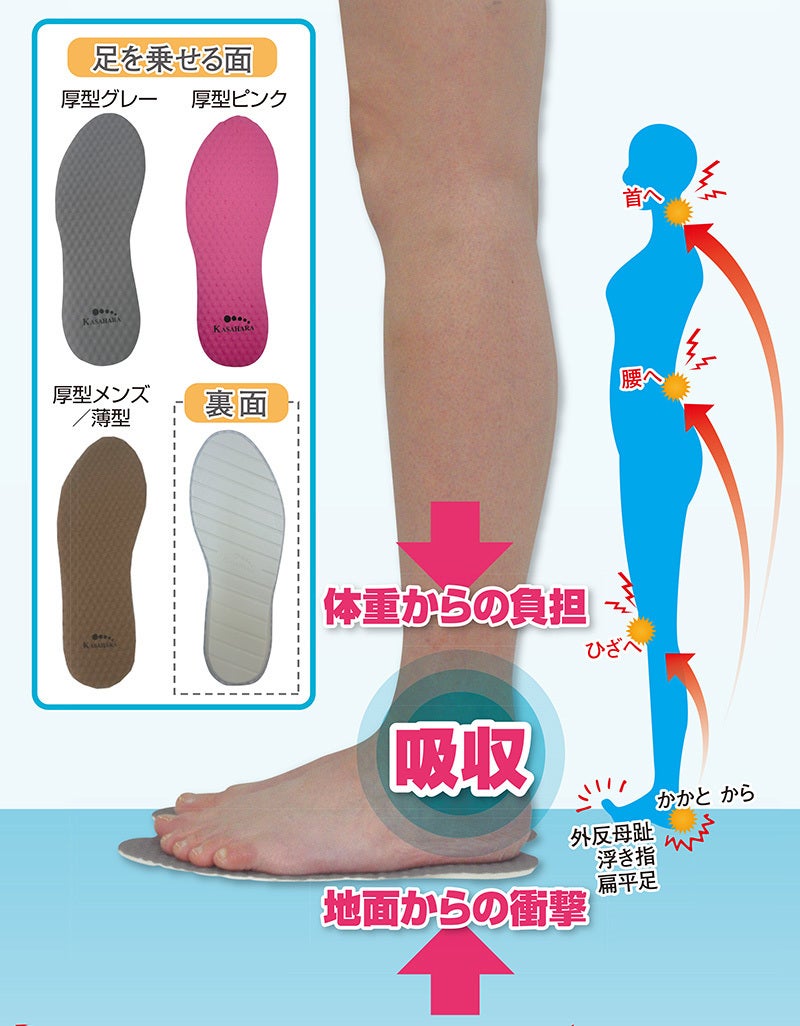 :人工筋肉素材ソルボの優れたクッション性で、地面からの過剰な衝撃とねじれを吸収無害化し、足、ひざ、腰、首を守ります。