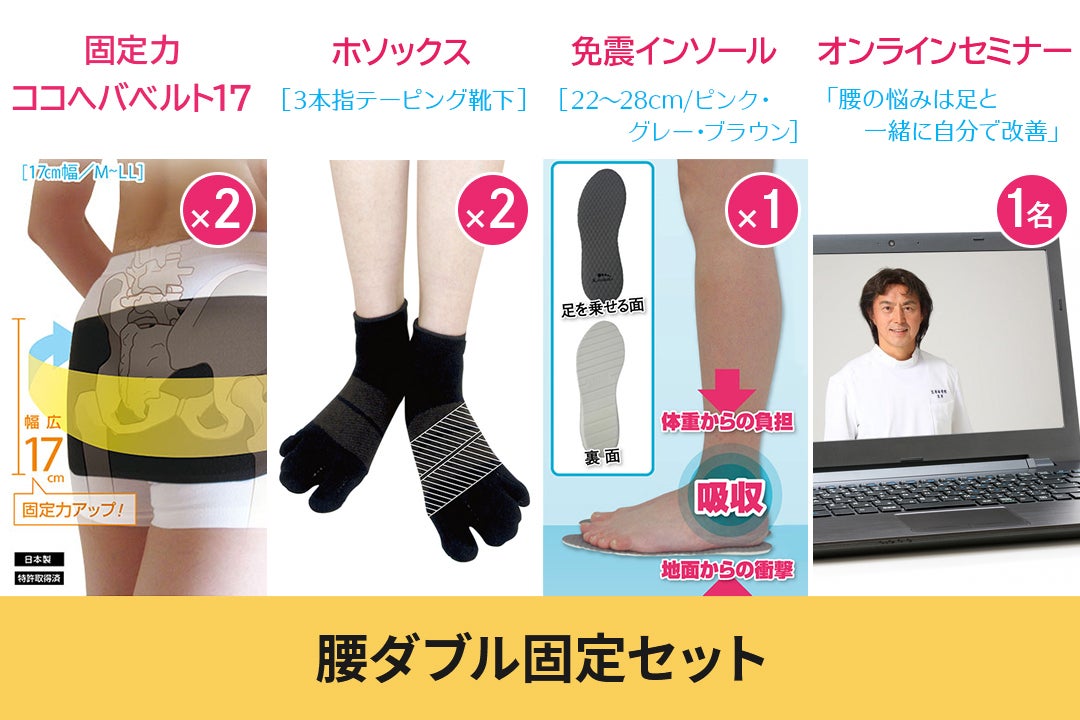 「固定力ベルト」に加え、足裏のバランスを整え、踏ん張れるように促す「3本指テーピングサポーター(靴下タイプ)」と、歩行時に足裏から腰へ繰り返される過剰な衝撃とねじれを吸収無害化する人工筋肉素材ソルボの優れたクッション性、「免震インソール」をお得なセット価格でご用意しました。