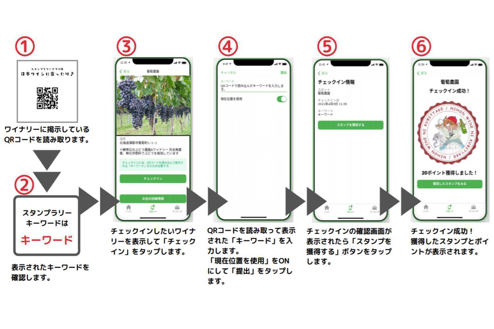 2022/11/11 07:16クラウドファンディングにご支援いただきました皆さま。日本ワインスタンプラリーアプリ実行委員会代表の天越 千愁(しど せんしゅう)です。本当に大変長らくお待たせいたしました!いよいよ本日11月11日より「日本ワインスタンプラリーアプリ」が、全国一斉にスタート致します。旅行支援を利用した観光旅行などのお供にされて旅先での日本ワイン情報取得などに是非とも日本ワインスタンプラリーアプリをご活用ください。【スタンプ&ポイント取得方法】①各店舗で日本ワインをご購入もしくは飲まれた方はお店でQRコードを読み取ります。②QRコードを読み取りますと「キーワード」の言葉のGoogle検索結果画面となります。キーワードが「ヤマネコ」でしたら「ヤマネコ」をGoogleで検索した画面が出てきます。※…QRコードを読み取るとすぐにスタンプを取得できる訳ではないのでご注意ください…※③取得したキーワードをアプリの各店舗のページで打ち込みましたらスタンプとポイントが獲得できます。※…QRコードを読み取りますと、すぐにスタンプが押されたり、キーワードがポンっと出てくる画面を想像される方が多いと思われますので突然出てくるGoogle検索画面に戸惑われる方も多く大変分かり辛くて恐縮ですが、不正防止のためにこのような形となっておりますのでご理解いただけましたら幸いです。…※ ④マイページのスタンプ帳やランキングページで獲得状況を確認してみよう。酒販店5P飲食店10P宿15Pワイナリー&シードルリー20Pポイントが獲得できますので、日本ワイン巡りでランキングトップを狙って素敵な商品をゲットされてくださいませ(^^)v 【スタンプラリー参加における注意点】●「要事前訪問確認」が記載されております店舗様以外にも、営業時間や定休日に変更がある場合もあり、個人ワイナリーや日本ワインの取り扱いが少ない店舗様などは品切れの場合もございますので事前に確認されてからご訪問くださいますようお願い致します。●伝達の行き違いや担当者の変更などで日本ワインスタンプラリーアプリを把握されていらっしゃらず、QRコードを装備されていない店舗も稀にある可能性もございます。その際は運営サイドまでお知らせいただけますようお願い致します。また、閉店や引っ越しなどにお気づきの場合にもお知らせいただけましたら幸いです。●訪問先の店舗様が通常業務を執行している際には十分な対応が出来ない場合もございますので臨機応変のご対応をお願い致します。●GPSの精度は環境によって誤差が生じるため、場所によって地図上で現在位置がずれる可能性がございますので、あらかじめご了承ください。特にAndroidは数十キロずれる機種や空が見えない場合は一切位置情報が取れない機種があります。このような端末に起因する位置情報の精度につきましては端末メーカーにお問い合わせください。Androidは「機内モードのオン/オフを切り替える」「地図アプリを併用して現在地を確認する」ことで精度が上がる場合があります。iPhoneは前回取得した位置情報がそのまま出ることがありますがその場合は再度位置情報を取得すると正しい現在地が出る傾向があります。 【アプリにご参加いただきお楽しみいただくには】完全無料、ダウンロード不要、ニックネームで簡単にご参加可能です!こちらのランディングページの『早速登録してアプリを使う』より、お気軽にお楽しみください。↓↓↓https://kubittake-stamprally.com/スタンプを集めて御朱印帳(御酒飲帳)にして楽しんだり、ポイントを集めてランキング上位を目指し素敵なプレゼントをゲットしたり、GPS機能を使った地図検索をはじめキーワード検索、都道府県検索等で日本ワインスポットを探したり、楽しみ方はいろいろです(^^)v【参加加盟店募集について】自薦他薦大歓迎!随時参加加盟店を募集しておりますので運営サイドにご連絡いただくかお気軽にこちらからご登録お申込みください。↓↓↓https://kubittake-stamp.glideapp.io/※…現在800軒以上のスポットのご掲載をいただいておりますので、是非お仲間となり共に盛り上げていただけましたら大変嬉しく思います。 【スタンプラリーの特典について】当アプリにはランキング機能がついており、ポイント数を稼ぎながら各地を巡るシステムとなっています。毎年12月に年間上位者の方にプレゼントを贈らせていただきます。(プレゼント内容はオリジナルグッズや旅行券、タイアップを予定している企業様からのノベルティグッズ等詳細はランディングページや各SNSなどで告知致します)【スタンプラリー公開記念イベントについて】8月21日に開催を予定してコロナで延期となりましたスタンプラリー公開イベント「和韻フライト2022」は「和韻フライト2023」として2023年3月25日(土)の開催を予定しております。全国のワイナリー様50社が結集するこちらのイベントにアプリ登録をした上でご参加いただきますと、イベント特典ポイント100Ptを進呈致します。