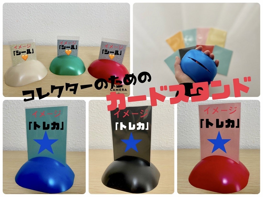 トレーディングカードやキャラクターシールとクリップ型カードスタンドとのマッチングが