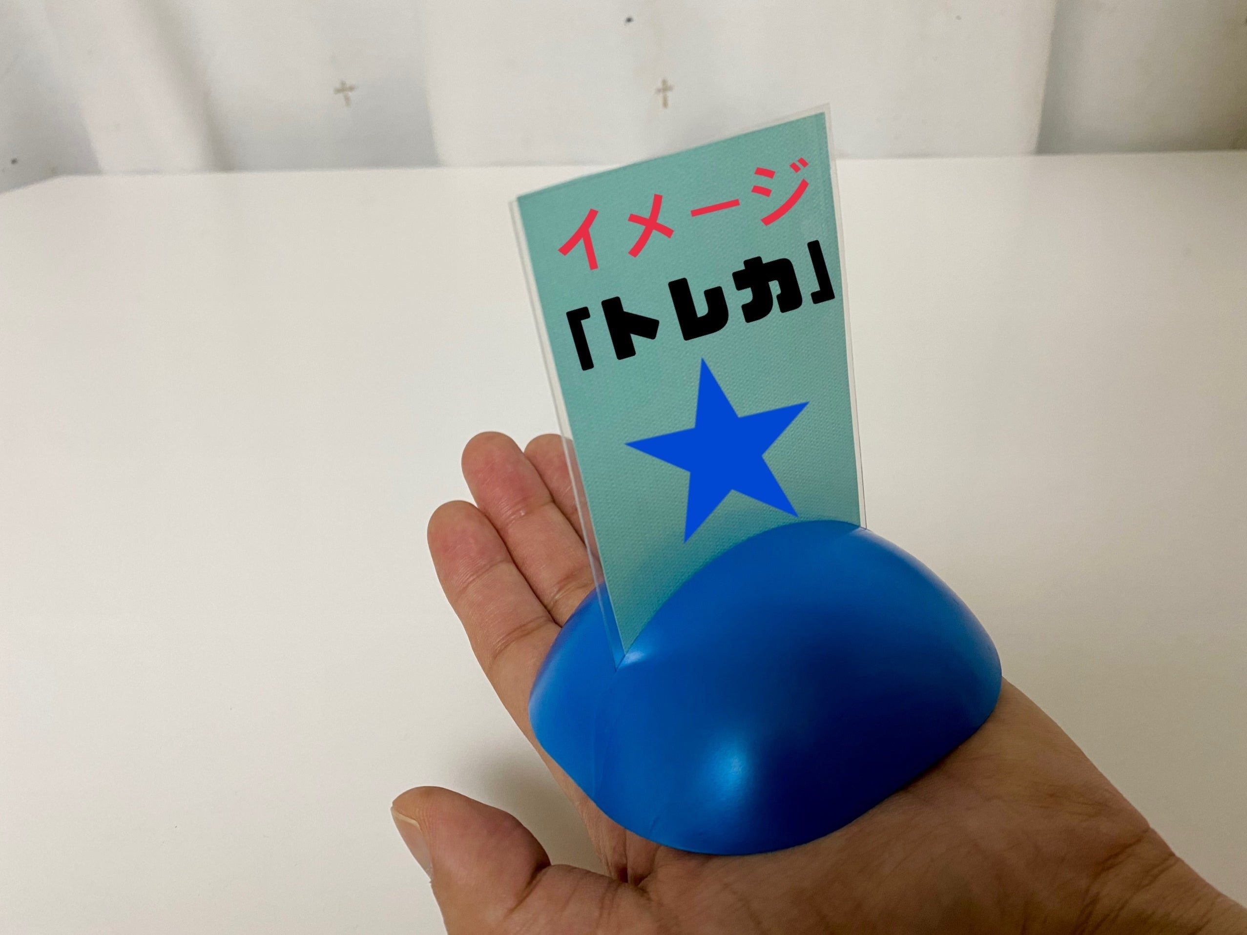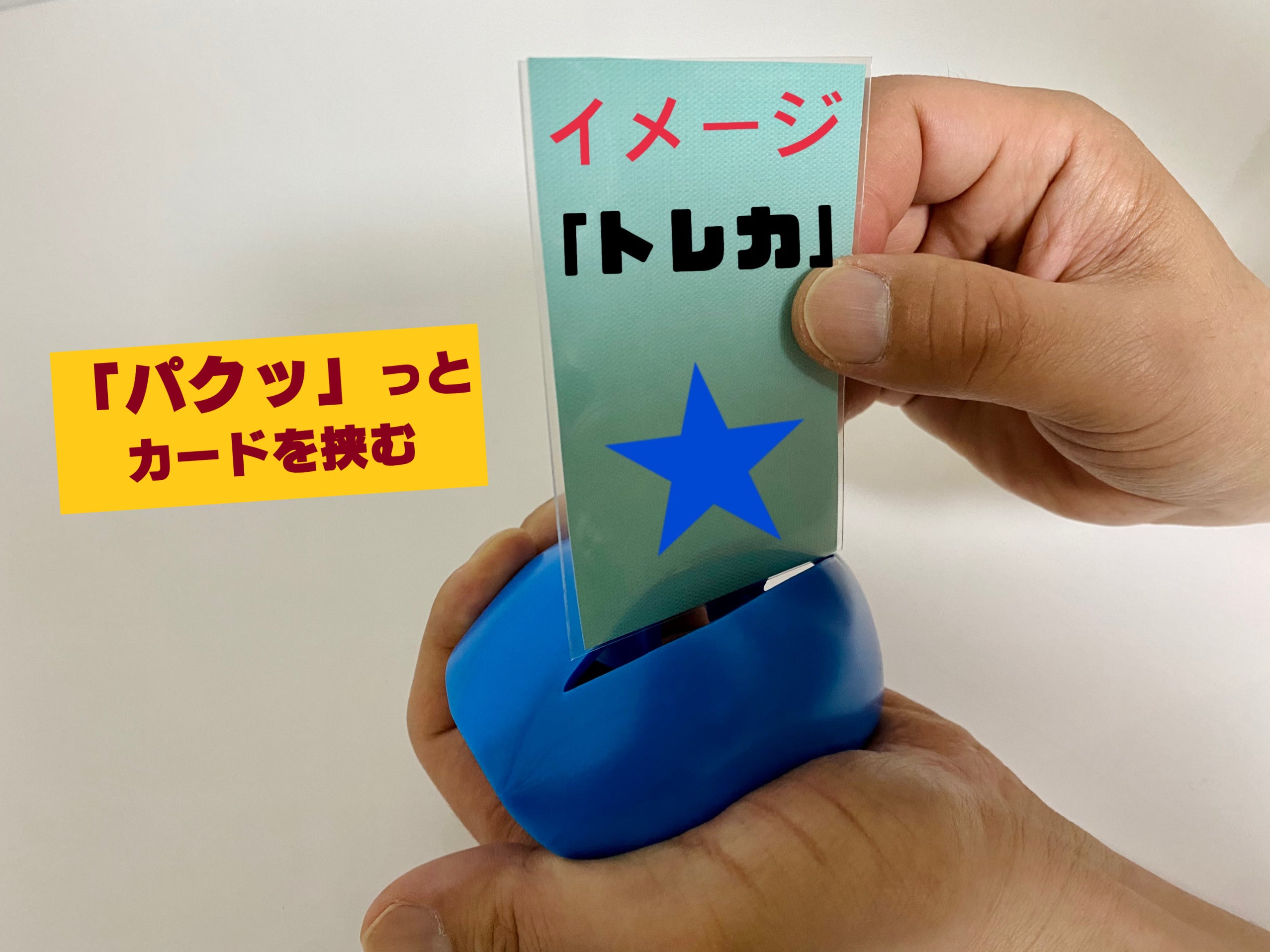 「むぎゅむぎゅ」という表記ワードは、製造側(弊社)としては〔クリップ型カードスタンド本体のスリット部を開く時にムギュっと握って開く〕ので「むぎゅむぎゅ」と表現表記をしました。