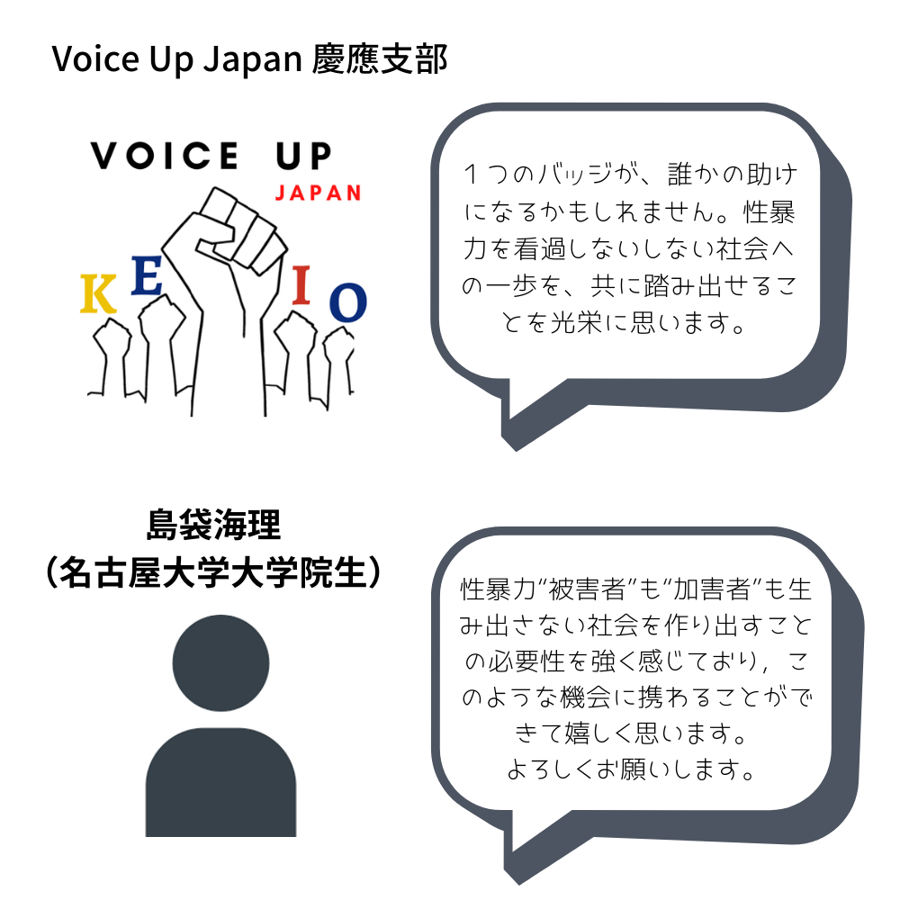 このプロジェクトでは、「性暴力を容認しない」「アクティブバイスタンダー(積極的に被害を止める第三者)として性暴力被害を見過ごさず、状況に応じてできる限りの行動をし、その行動に責任を持つ」ことができる方にバッジとカードを配布いたします。バッジを身に付けていただくことで、日本における性暴力の現状と第三者の重要性の啓発につながるだけでなく、「私はいつでも被害者の味方である。」ということも負担なく表明することができます。今回、悪用を防ぐためにも配布の対象は、共催の学生団体、ジェンダーや性教育の専門知識を持つ先生や、カウンセラーの方々になります。