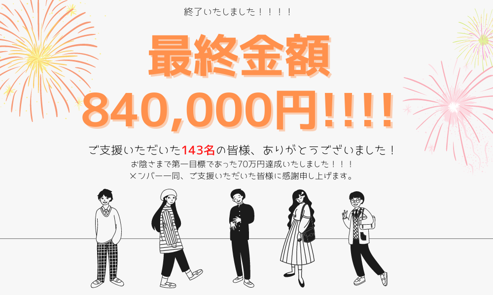 2021/07/01 02:34応援していただいた皆様へこんばんは〜今日が最後の活動報告になります!!!寂しい!!!!!(毎回夜遅くに通知がいってしまっていたみたいでごめんなさい...笑 今日で最後です!)さて、今日はクラファン、デザインの締め切り日でした。そして、ストレッチゴールの85万円を達成することはできなかったのですが、最終的な支援額は84万円になりました皆さん、本当に本当にありがとうございました!!!!!!!!今日のクラブハウスのカウントダウンにも、多くの方に来ていただき、本当に嬉しかったです。ここに、お名前を全て記載することはできないのですが、この後随時、ご支援いただけた方にはお礼のメールをお送りさせてください。クラブハウスの中でもお話したのですが、始めた当初は2万円しか集まらず、残り68万円をどうやって集めようか、死ぬほど悩んでいました...............笑 そんな時に、痴漢抑止バッチの松永さんに助けられ、その後も、クラブハウスで多くの大人の方々に助けられました。そしてその度に、メンバーと「こんな大人になりたい」コールで盛り上がりました。(本当です。)実は、このプロジェクトを通して私含む社会に出る前の1~4年生の学生が、それぞれの理想の大人に出会えたことって私たちメンバー全員にとっての財産だなあと思っています。クラブハウスでなければ絶対に出会えなかったような人たちとお話でき、そしてその方の考えを知ることができ、少しでも関わってもらえたからこそ、知れた新しい世界があります。私たち学生にとって、新しいことに触れるという経験は、活動を活性化するだけではなく、人生そのものを豊にすることのできる貴重な経験です。まだ、若いからこそ新しいものに対しての抵抗がないのかも知れませんが、歳をとっても今回のプロジェクトでそうであったように、まずは自分の中に取り入れて咀嚼してみる、そうすることで物事を多角的に捉えられる人間になっていきたいと思いました。さて、少し自分の学びを書いてしまったのですが、このプロジェクトはスタートラインに立ったばかり。バッジを生産した後に、「アクティブバイスタンダー」を増やすためにまだまだ沢山のアクションを起こしていかなければいけません。今回、クラウドファンディングを通して出会ってくれた方々、私たちの長旅を暖かく見守ってくださると嬉しいです。学生団体ということもあり、卒業するメンバーも出てきますが、活動と信念は引き継がれていきます。見て見ぬふりをしない人、アクティブバイスタンダーを増やすために、一人一人ができる範囲で、頑張っていきましょう。最後に、ここまで応援していただいた方々、ご支援していただいた方々、デザインを応募していただいた方々、本当にありがとうございました。メンバー一同、心から感謝申し上げます。 もっと見るクラファン 前夜祭!とあるカナダの大学の話