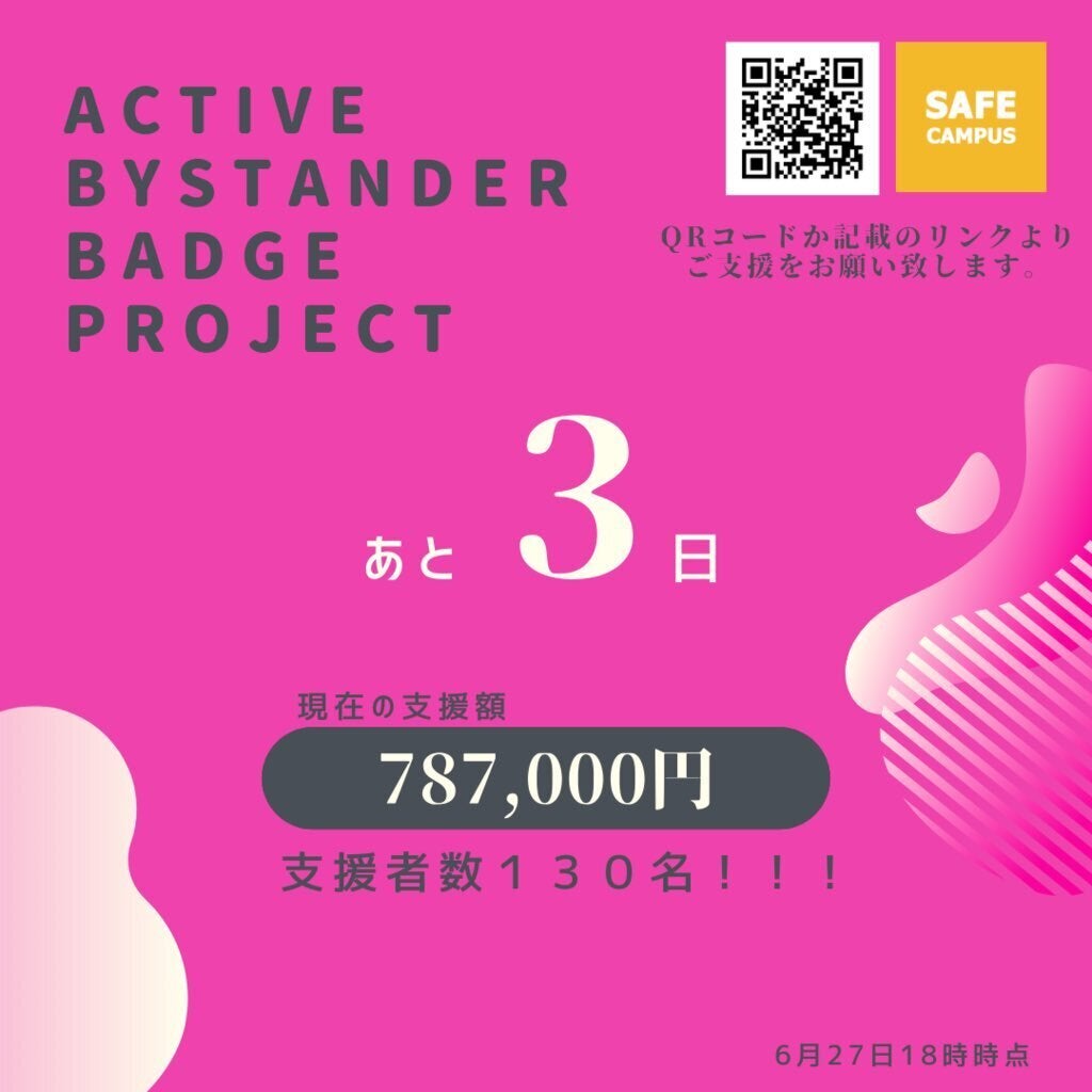 応援していただいた皆様へこんばんは〜今日が最後の活動報告になります!!!寂しい!!!!!(毎回夜遅くに通知がいってしまっていたみたいでごめんなさい...笑 今日で最後です!)さて、今日はクラファン、デザインの締め切り日でした。そして、ストレッチゴールの85万円を達成することはできなかったのですが、最終的な支援額は84万円になりました皆さん、本当に本当にありがとうございました!!!!!!!!今日のクラブハウスのカウントダウンにも、多くの方に来ていただき、本当に嬉しかったです。ここに、お名前を全て記載することはできないのですが、この後随時、ご支援いただけた方にはお礼のメールをお送りさせてください。クラブハウスの中でもお話したのですが、始めた当初は2万円しか集まらず、残り68万円をどうやって集めようか、死ぬほど悩んでいました...............笑 そんな時に、痴漢抑止バッチの松永さんに助けられ、その後も、クラブハウスで多くの大人の方々に助けられました。そしてその度に、メンバーと「こんな大人になりたい」コールで盛り上がりました。(本当です。)実は、このプロジェクトを通して私含む社会に出る前の1~4年生の学生が、それぞれの理想の大人に出会えたことって私たちメンバー全員にとっての財産だなあと思っています。クラブハウスでなければ絶対に出会えなかったような人たちとお話でき、そしてその方の考えを知ることができ、少しでも関わってもらえたからこそ、知れた新しい世界があります。私たち学生にとって、新しいことに触れるという経験は、活動を活性化するだけではなく、人生そのものを豊にすることのできる貴重な経験です。まだ、若いからこそ新しいものに対しての抵抗がないのかも知れませんが、歳をとっても今回のプロジェクトでそうであったように、まずは自分の中に取り入れて咀嚼してみる、そうすることで物事を多角的に捉えられる人間になっていきたいと思いました。さて、少し自分の学びを書いてしまったのですが、このプロジェクトはスタートラインに立ったばかり。バッジを生産した後に、「アクティブバイスタンダー」を増やすためにまだまだ沢山のアクションを起こしていかなければいけません。今回、クラウドファンディングを通して出会ってくれた方々、私たちの長旅を暖かく見守ってくださると嬉しいです。学生団体ということもあり、卒業するメンバーも出てきますが、活動と信念は引き継がれていきます。見て見ぬふりをしない人、アクティブバイスタンダーを増やすために、一人一人ができる範囲で、頑張っていきましょう。最後に、ここまで応援していただいた方々、ご支援していただいた方々、デザインを応募していただいた方々、本当にありがとうございました。メンバー一同、心から感謝申し上げます。