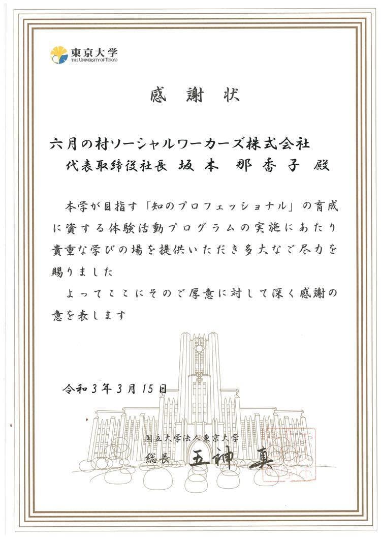 そんな中、東京大学の学生が「六月の村」のイベントに参加する機会がありました。その貢献に対して東京大学から感謝状を受け取りました。しっかりと応援の気持ちを受け取って、これからも頑張ります。
