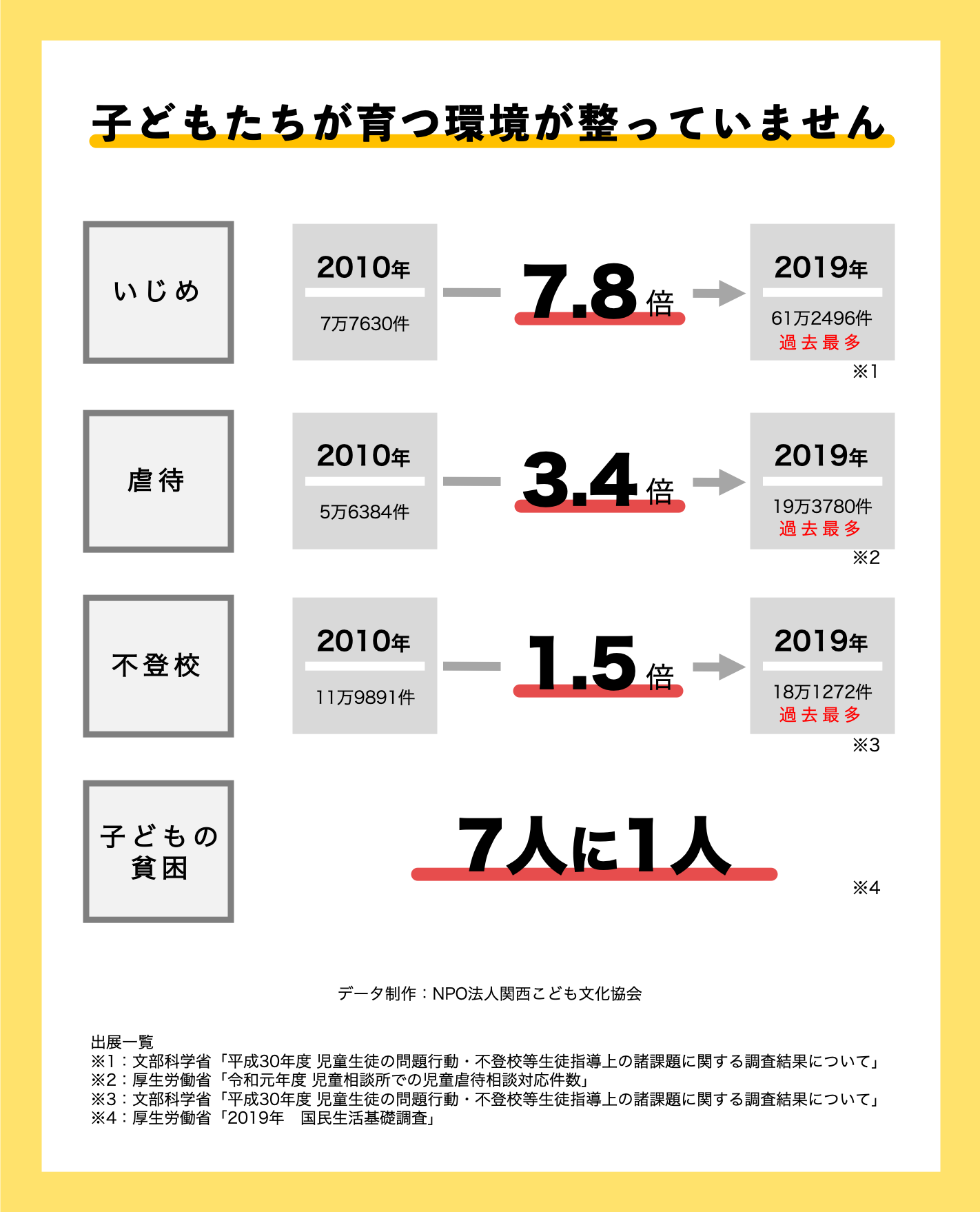 虐待やいじめは年々増え続け、子どもたちが命を落としてしまうようなケースも後を絶ちません。また、不登校の子どもたちの数は増え続けていますが、いまだに学校内外での受け皿は足りていません。さらに相対的な貧困状態にある子どもたちは7人に1人にのぼり、家庭の経済状況が子どもたちの学びや育ちに大きな影響を及ぼしてるのが現状です。