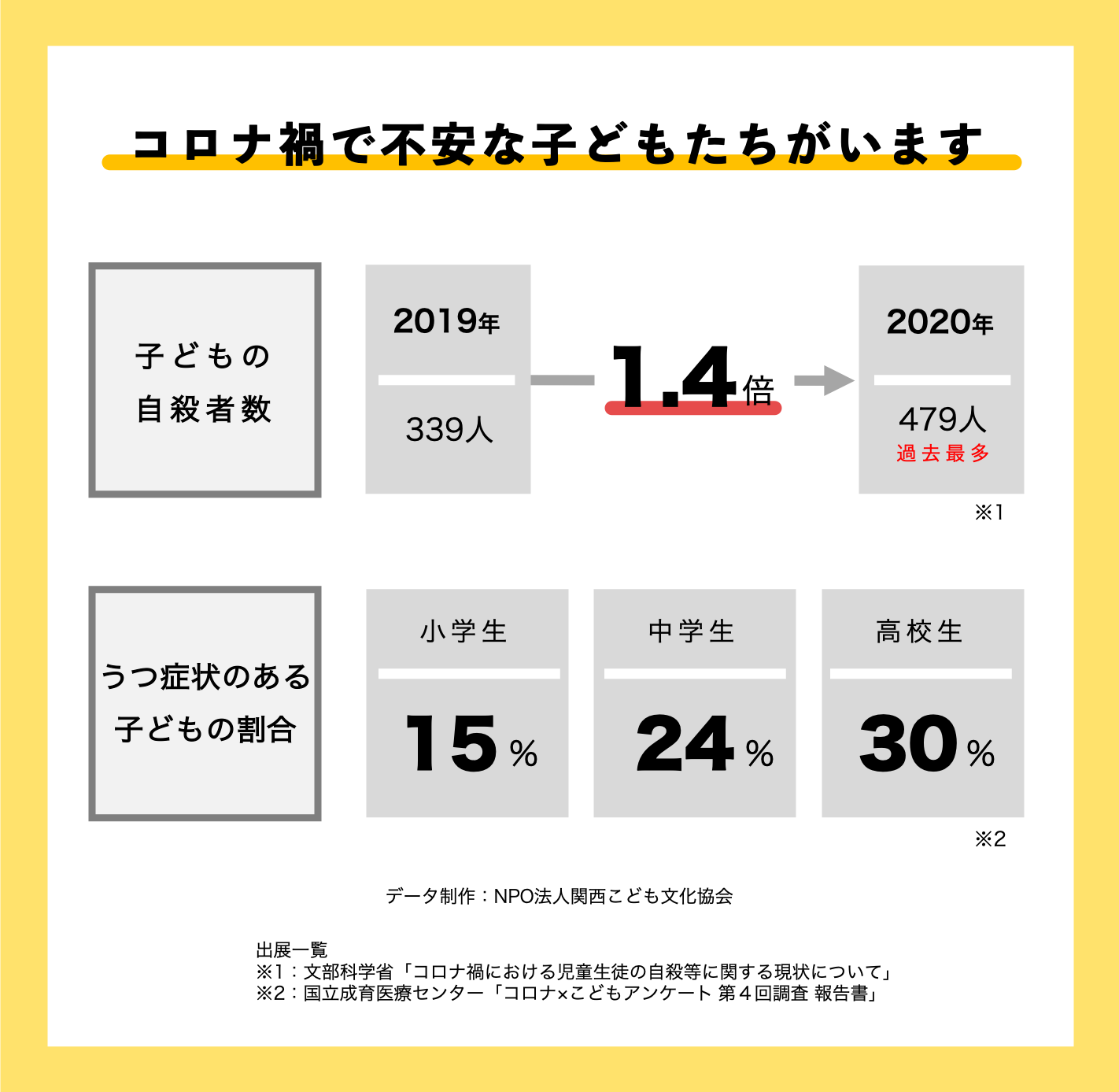 こうした変化は子どもたちがストレスや不安を抱えたまま孤立する要因となっています。その結果、2020年の子どもの自殺者数は過去最多の479人のぼり、国立成育医療研究センターの調査では子どもたちの15%以上が中等度以上のうつ症状が見られたいう結果が出ています。