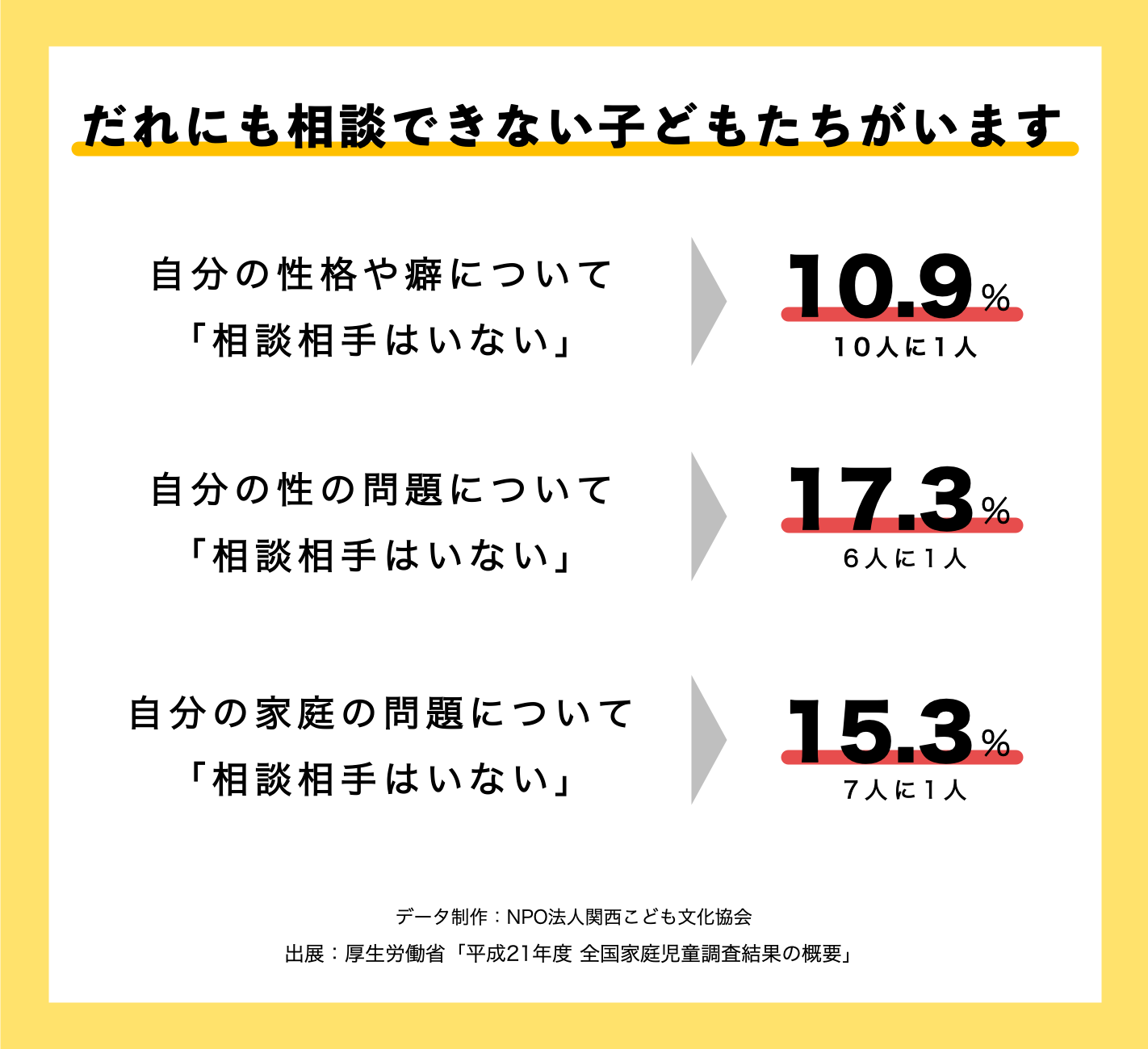 厚生労働省の「全国家庭児童調査結果」では、「相談相手はいない」と回答したのは、「自分の性格や癖について」は10.9%、「自分の性の問題について」は17.3%、「自分の家庭の問題について」は15.3%にものぼります。