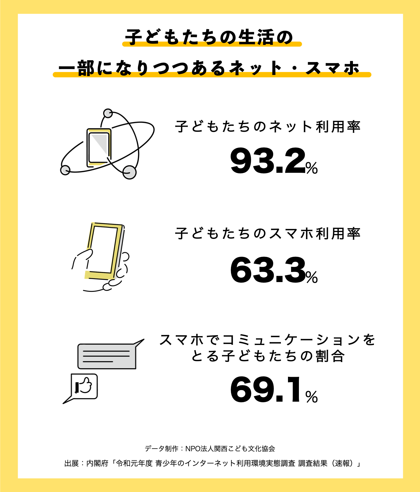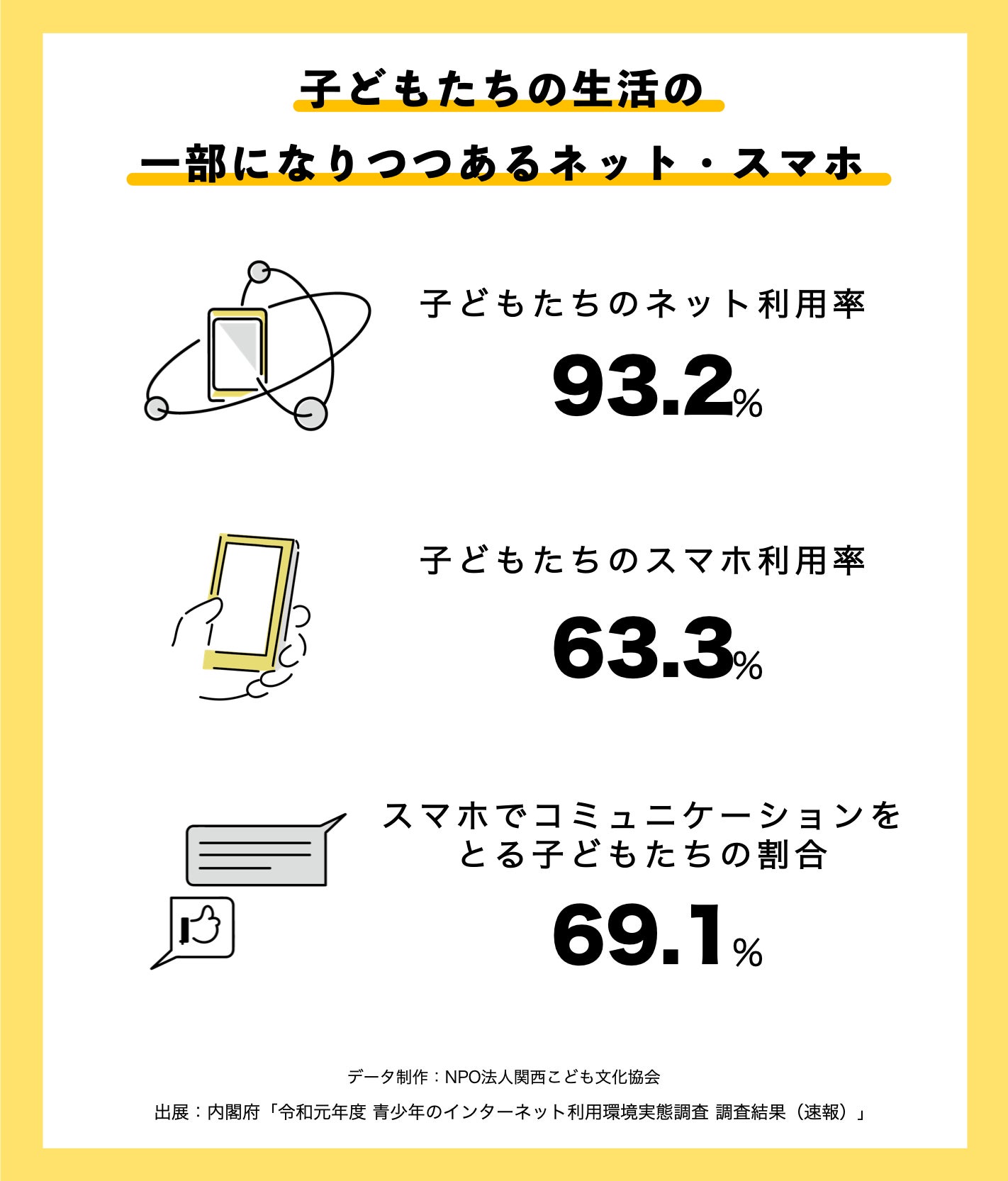93.2%の子どもたちが日常的にインターネットを使い、63.3%の子どもたちがスマートフォンを持ち、ネットやスマホでコミュニケーションをとるのが当たり前になっています。また、「令和2年版子供・若者白書」によると、相談などの求める支援の形態の項目で「SNSで相談する」と答えたのは26.4%にものぼります。しかし、このニーズに合わせた相談窓口はまだまだ不足しているのが実情です。子どもたちが自分の気持ちを話したり、困っていることをネットやスマホで気軽に相談できるセーフティネットが必要です。