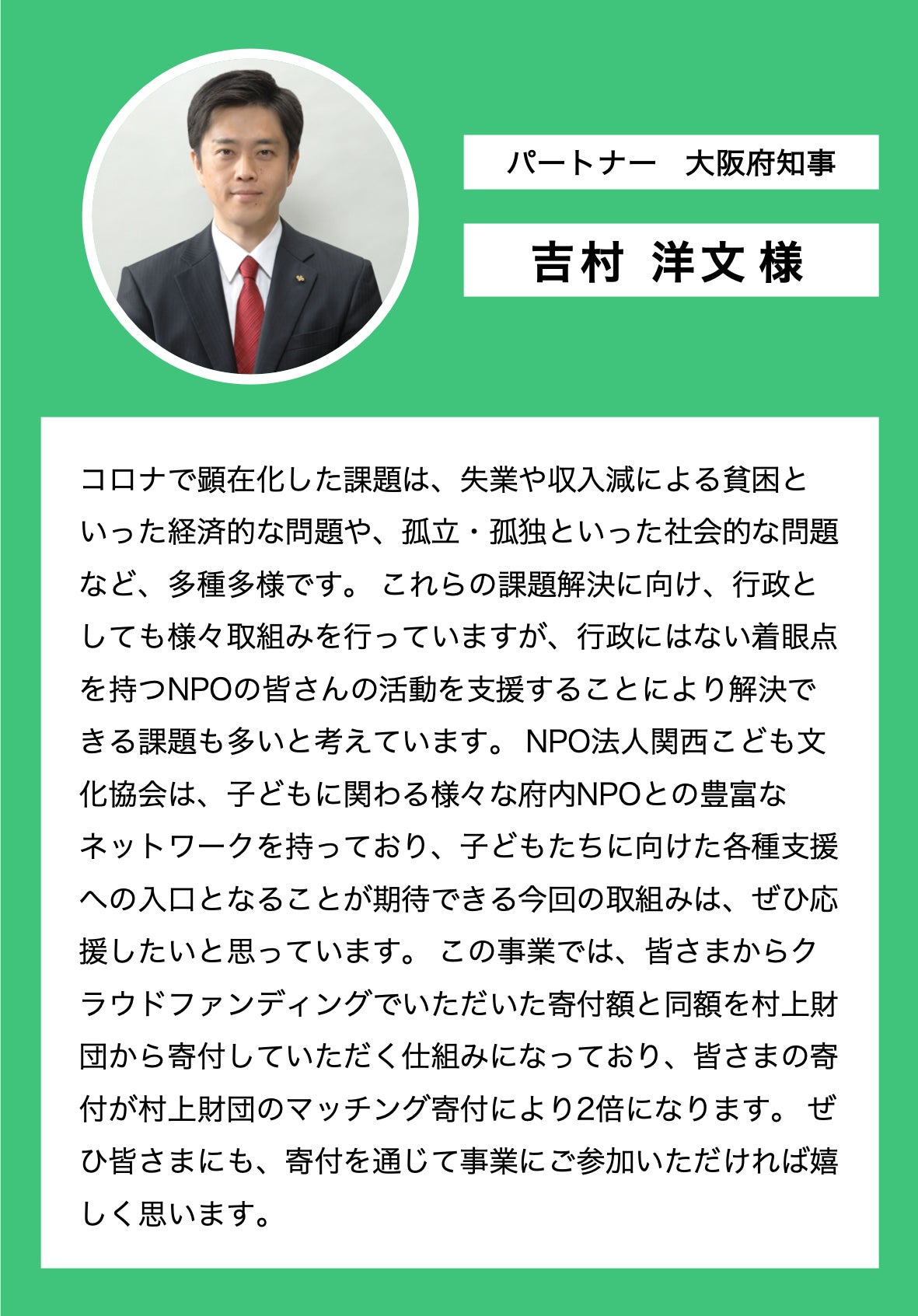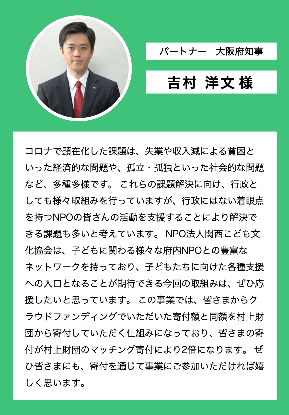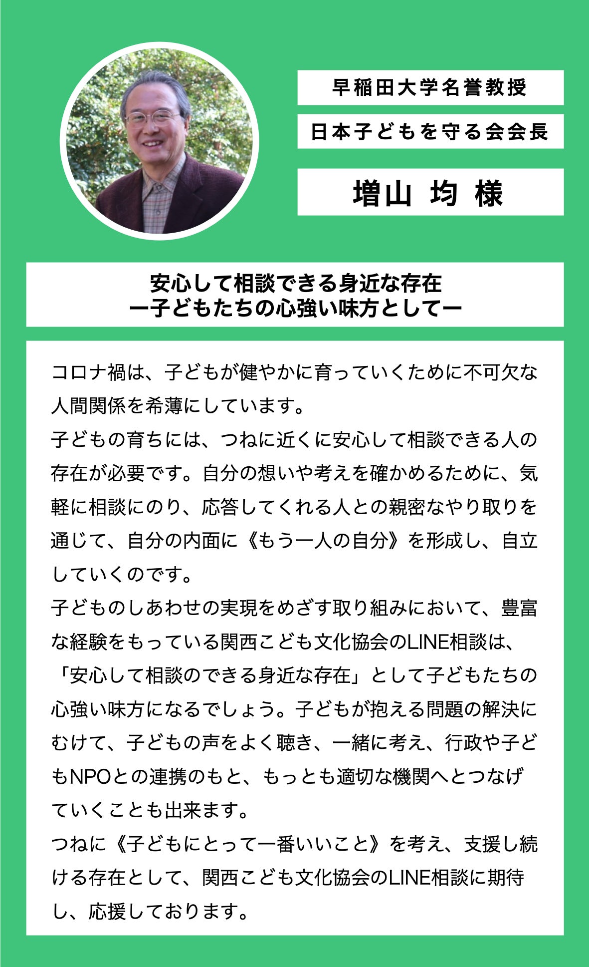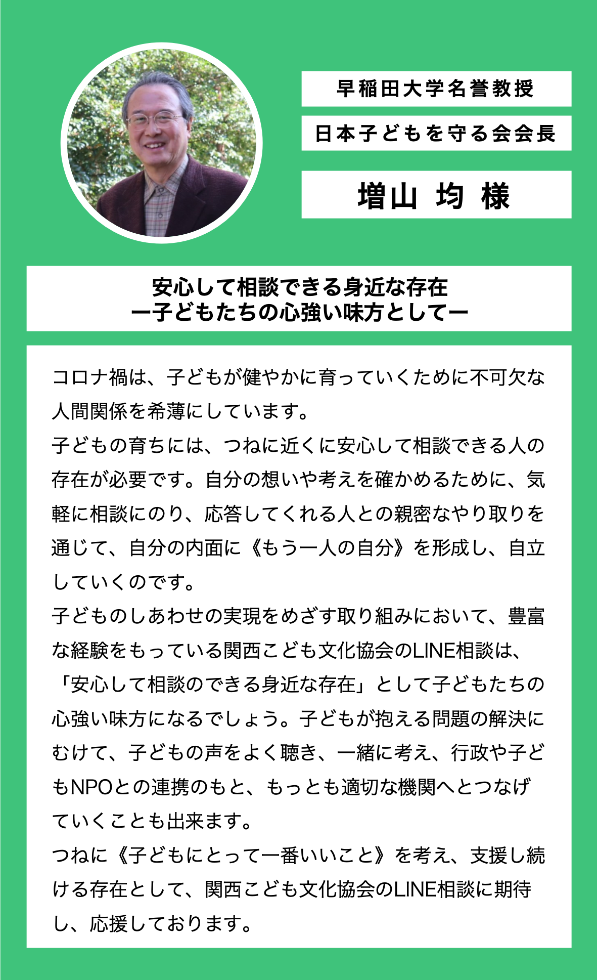 こんな時、子ども食堂や子どもの居場所づくりなど、子どもの関係作りで実績を蓄積してきた関西こども文化協会がクラウドファンディングを立ち上げ、「LINEによる子ども相談」事業を幅広く展開することは、問題に歯止めをかけ、新しいソーシャルセフティーネットの形成と子どもと大人の世界に大きな安心感を生み出すでしょう。みなさまのご支援を心からお願い申し上げます。