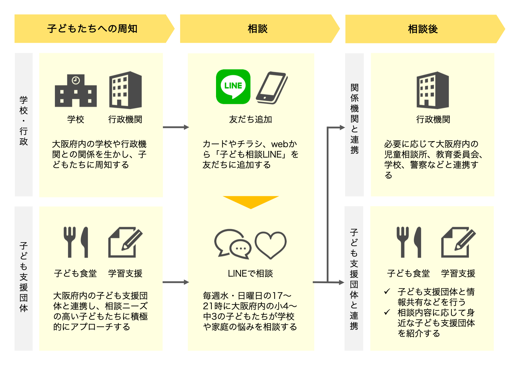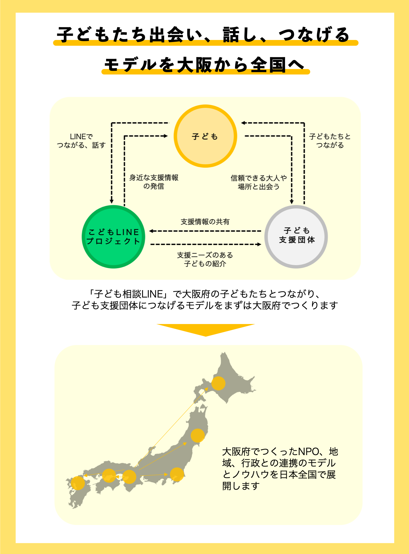 この経験を生かし、大阪府内の子ども支援団体と連携しながら、子どもたちが気軽にLINEで相談できる場所をつくります。また、連携によって生まれるネットワークを生かし、子どもたちを見守るインフラを大阪からつくっていきます。