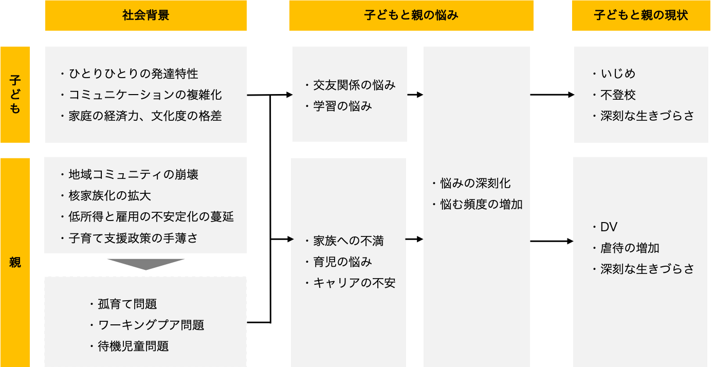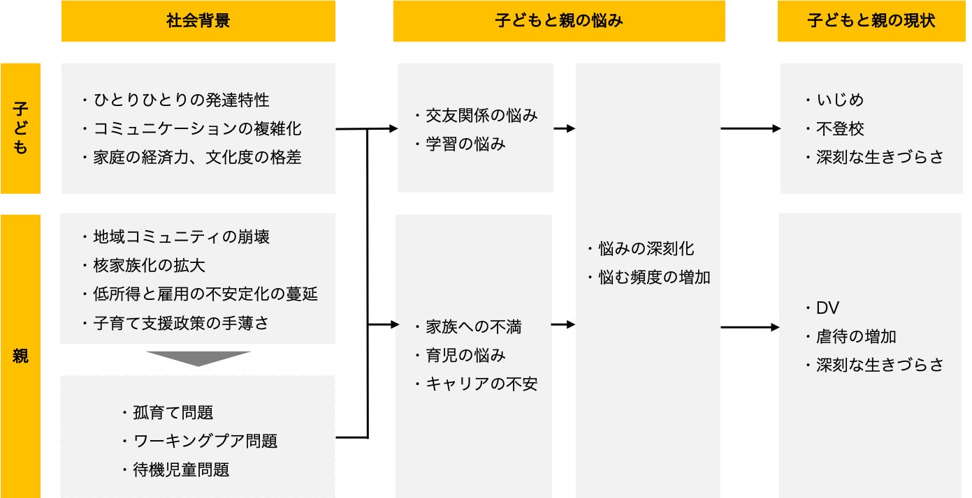 また、虐待、不登校、経済困窮世帯などの相談ニーズが高い子どもたちの相談は一度悩みや不安を聞くだけでは解決しづらく、継続的に支援していくことが必要不可欠です。しかし、LINEなどのSNSを用いた相談では一時的な相談や支援になってしまうことが少なくありません。さらに、こういった状況にある子どもたちほど、コロナ禍による家庭や学校での変化を受けやすい状況にあります。それにも関わらず継続的に支援できる体制がありません。