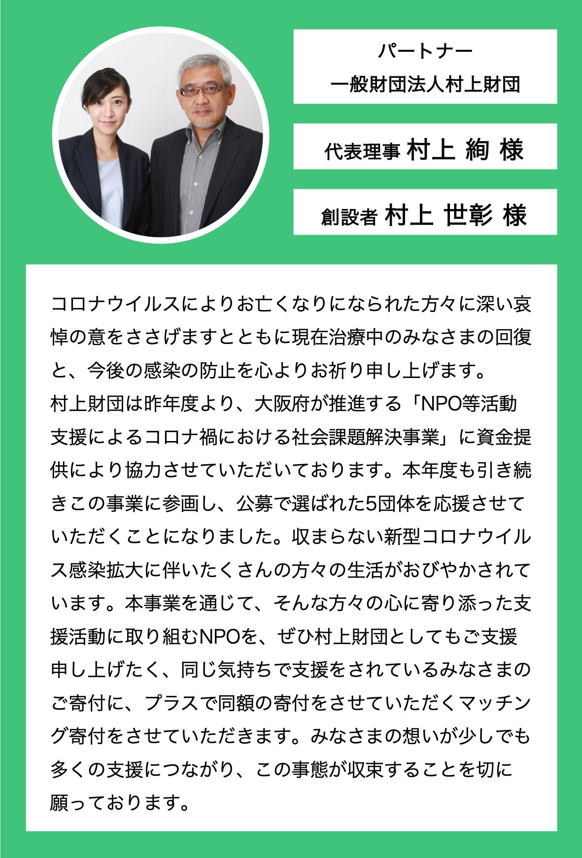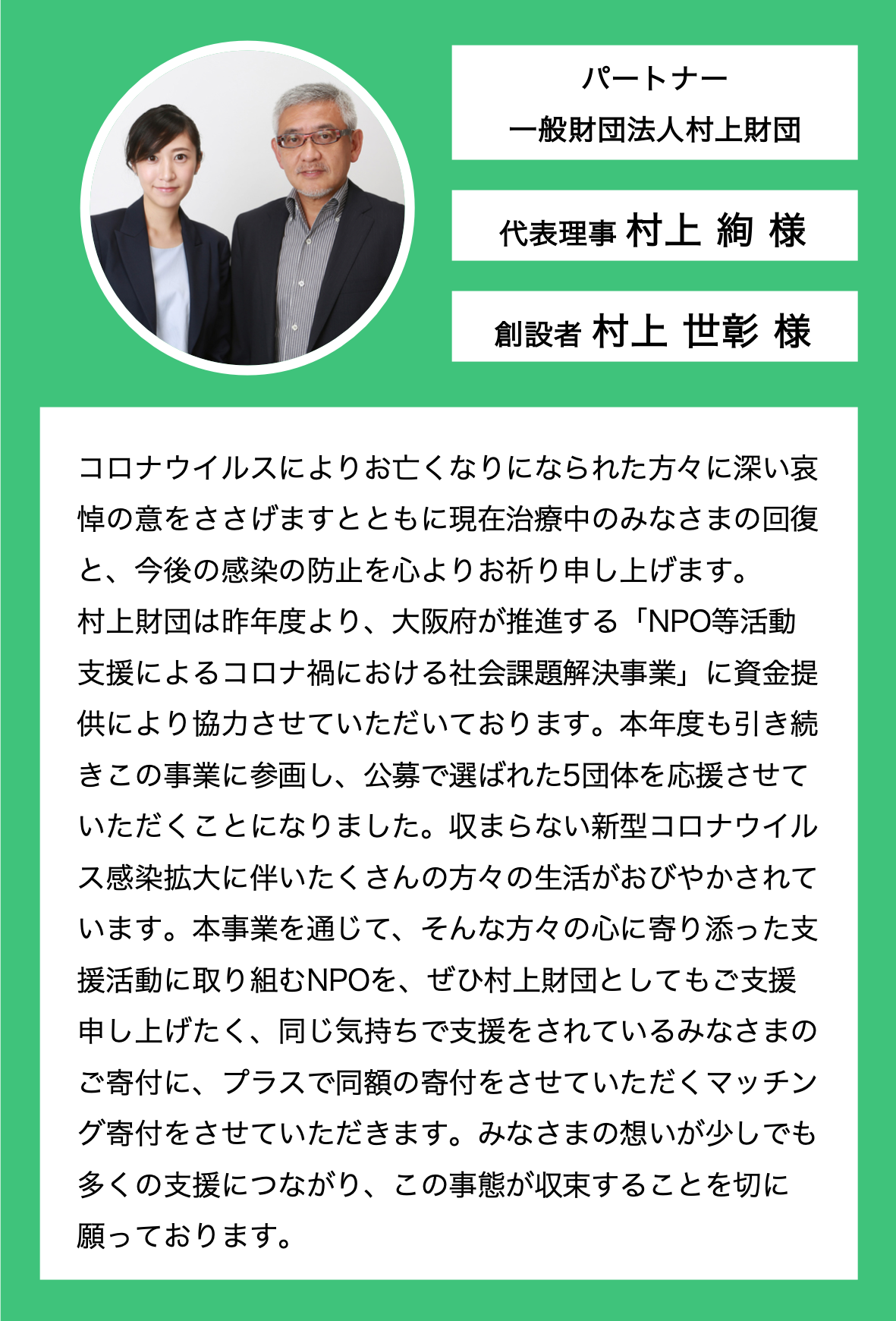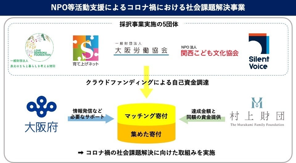 また、今回のプロジェクトでは大阪府「NPO等活動支援によるコロナ禍における社会課題解決事業」の1つの事業として採択されています。