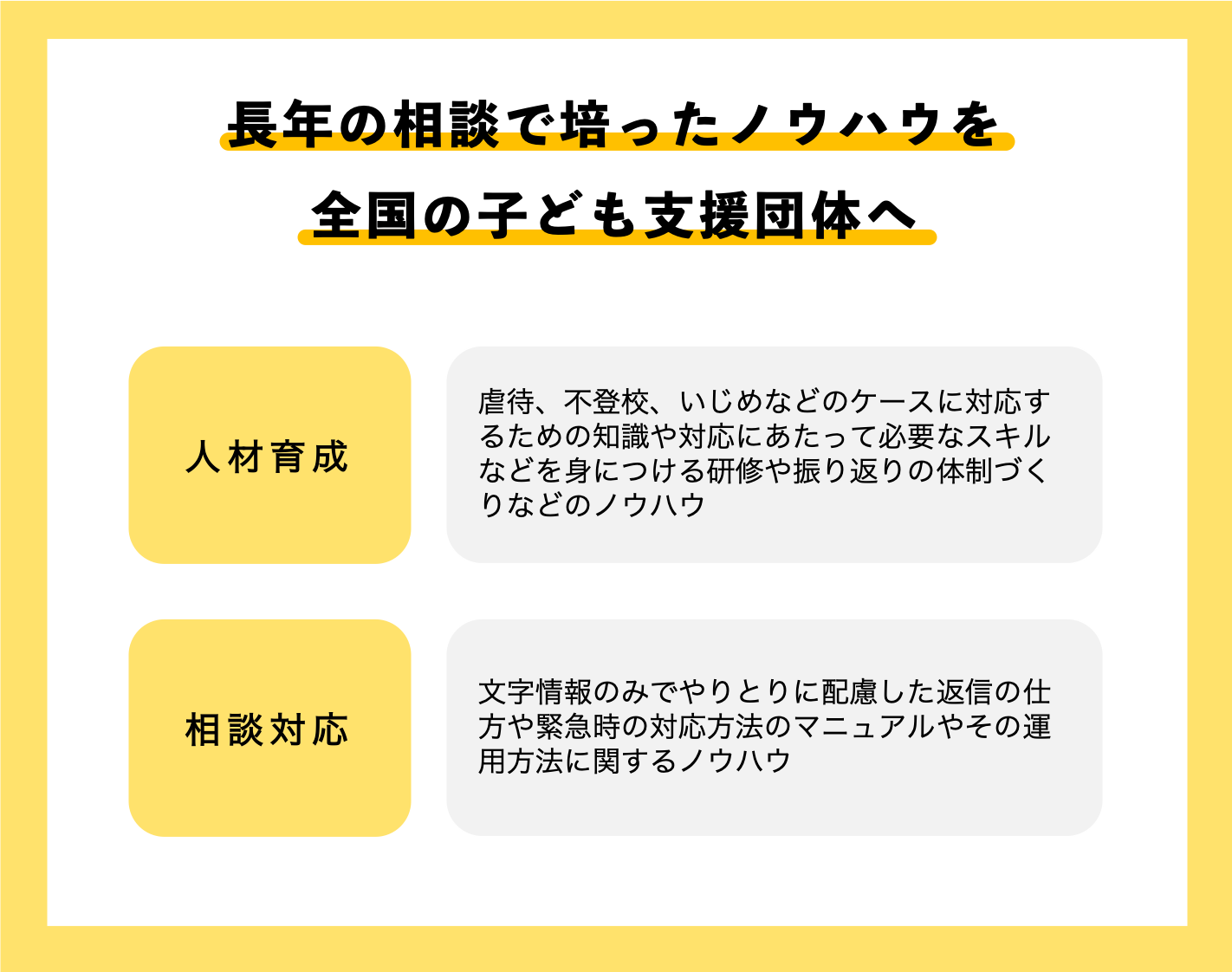 そうして培った相談員の人材育成のノウハウや子どもの相談に特化した相談対応のノウハウを、今後さらに広がっていくLINEでの相談に生かしていきます。さらに、このノウハウをLINEやSNSを活用して子どもの相談を受け付けようとしている全国の団体にも提供していきます。