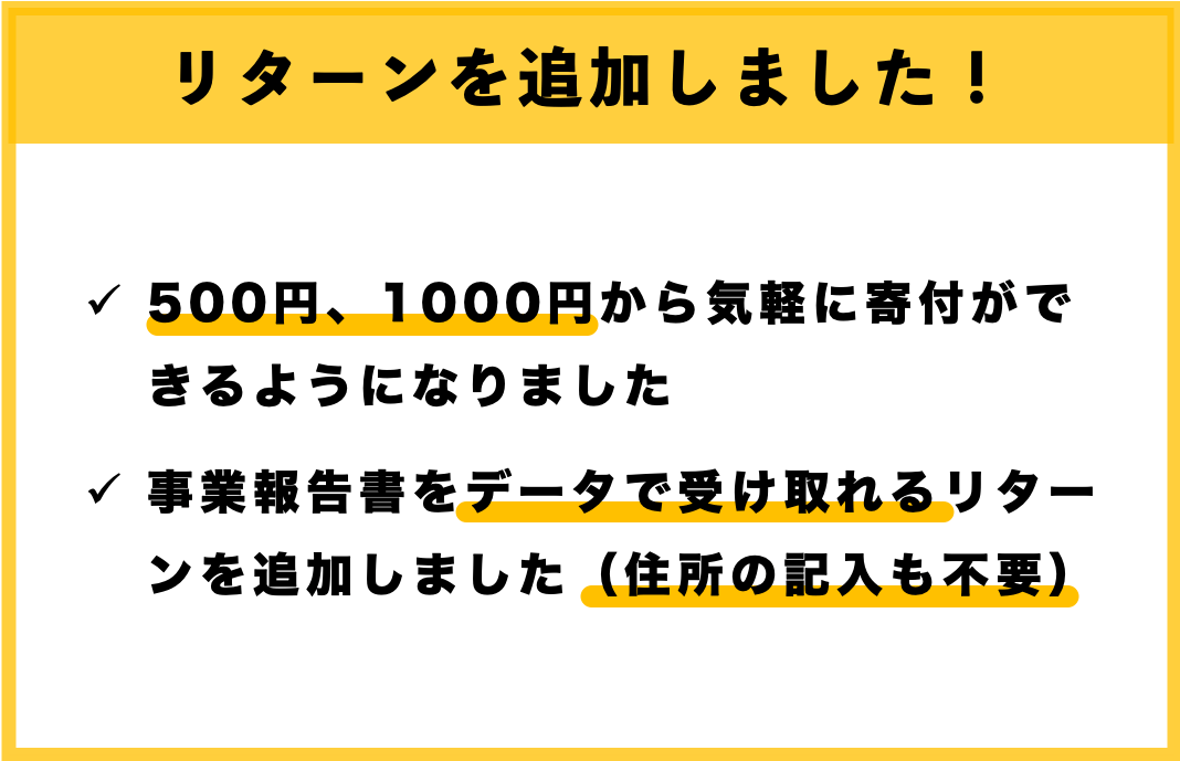 また、郵送するにあたって住所の記入をしていただく必要があり、「重要な個人情報である住所までは記入したくない」という方もいるため、リターンの事業報告書をデータで送付するものも追加しました。
