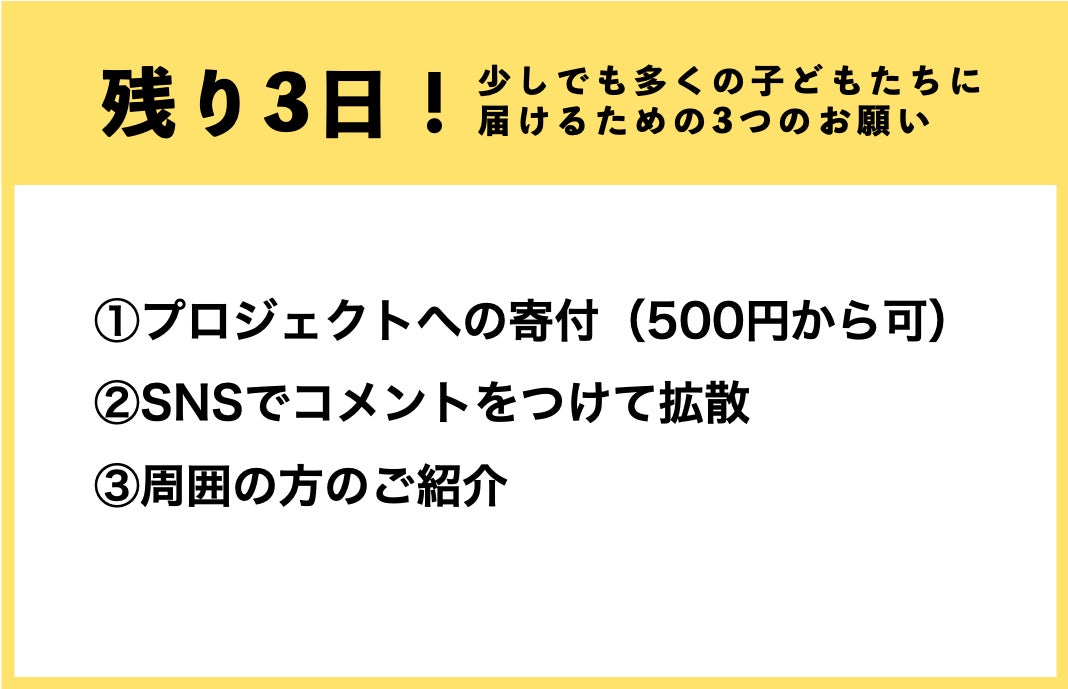 すでにたくさんの方にSNSで拡散していただいています。残り3日で継続してSNSで拡散していただきたいのと、その際に一言だけコメントつけてシェアしていただけるとありがたいです!