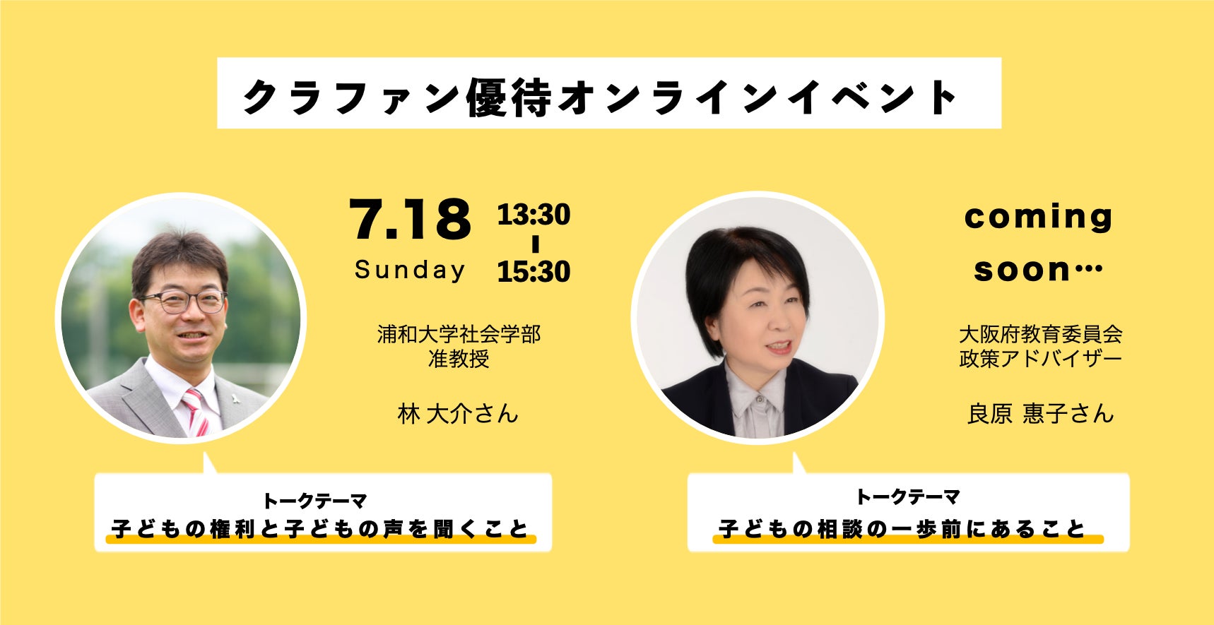 クラウドファンディング残り2日となりました!先日告知したクラウドファンディングでご支援いただいた方向けの優待オンラインイベントですが、ゲストが確定しました!1回目:『子どもの権利と子どもの声を聞くこと』ゲストに子どもの権利についての深い見識を持つ、浦和大学社会学部准教授の林大介さんをお招きします。「子どもの権利と子どもの声を聞くこと」というテーマで当協会理事長の松浦との対談形式で進めていく予定です。日時は7月18日(木) 13:30〜15:30の予定です。2回目:『子どもの相談の一歩手前にあること』ゲストに大阪府教育委員会の政策アドバイザーで、子どもの相談について豊富な経験をもつ良原惠子さんをお招きします。「子どもの相談の一歩手前にあること」というテーマで当協会理事長の松浦との対談形式で進めていく予定です。残り2日となりましたが、ぜひこのイベントに優先的に参加できる旨と一緒に周囲の方にご支援のお声かけをいただければ幸いです!!!