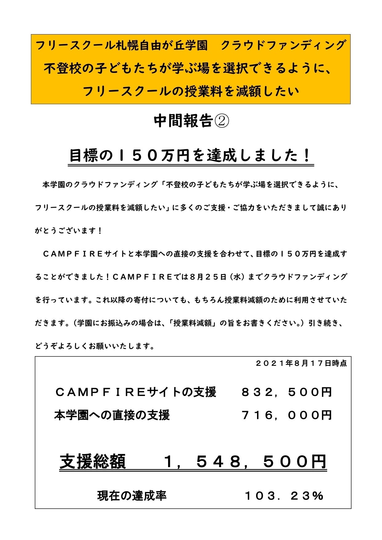 2021/08/18 09:15CAMPFIREサイトと学園への直接の寄付を合わせて、目標の150万円を達成しました!ありがとうございます!! もっと見る