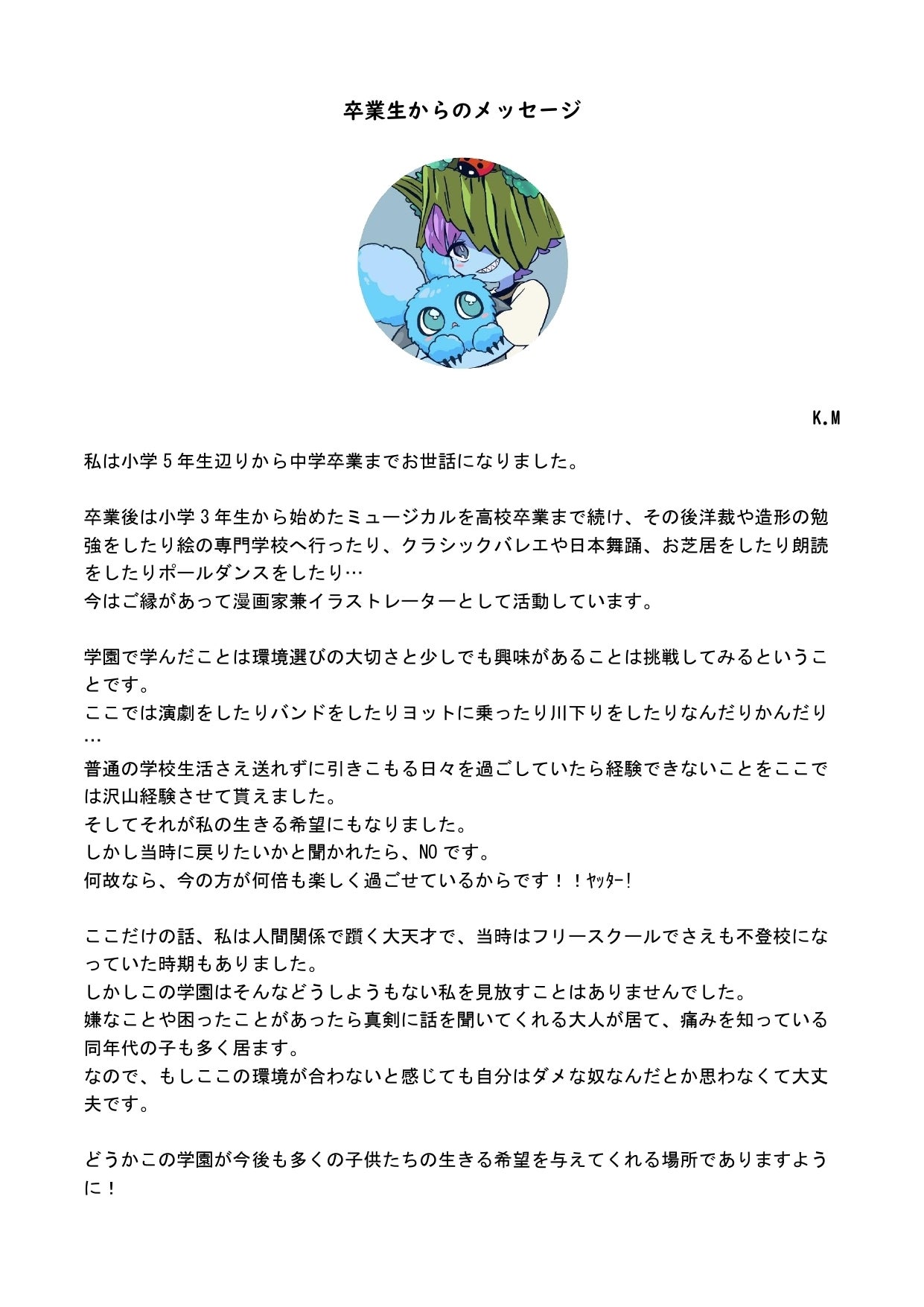 2021/08/18 16:59卒業生のK.Mさんよりメッセージをいただきました!漫画家になったという近況を聞いてびっくり。「今の方が何倍も楽しく過ごせている」なんて、スタッフもうれしいです! もっと見る