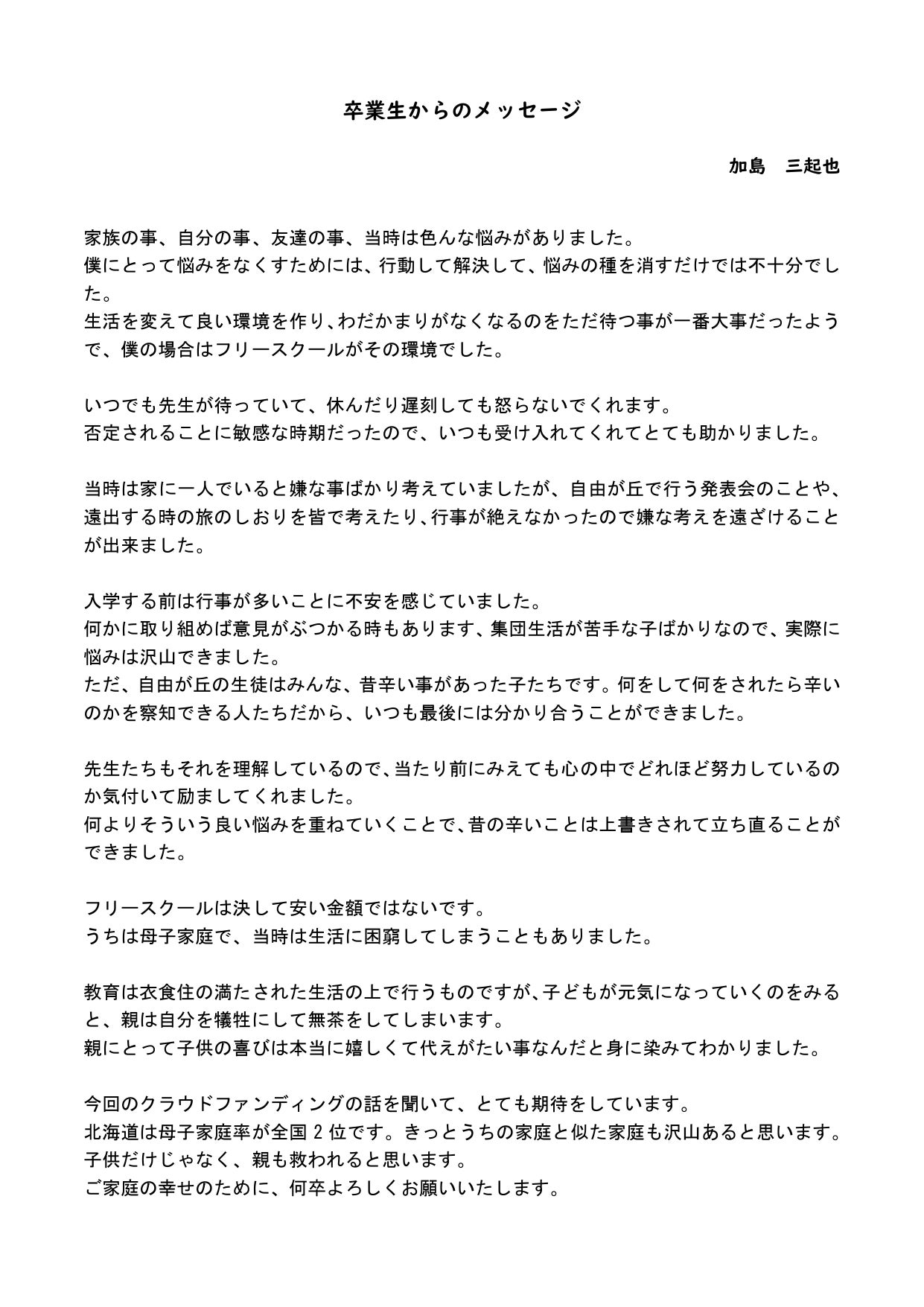 卒業生の加島三起也さんからメッセージをいただきました!フリースクールで過ごした当時の気持ちを振り返ってくれています。ぜひお読みください!