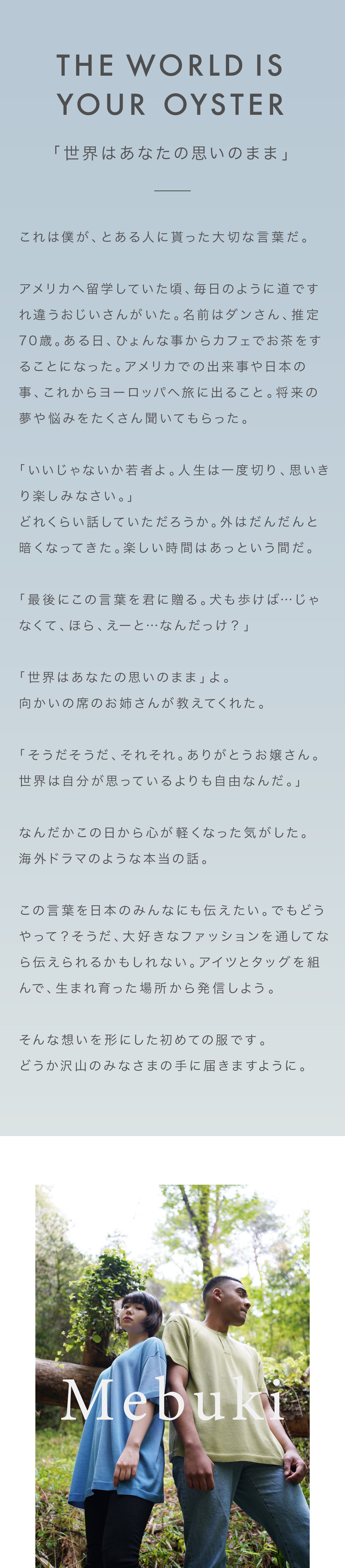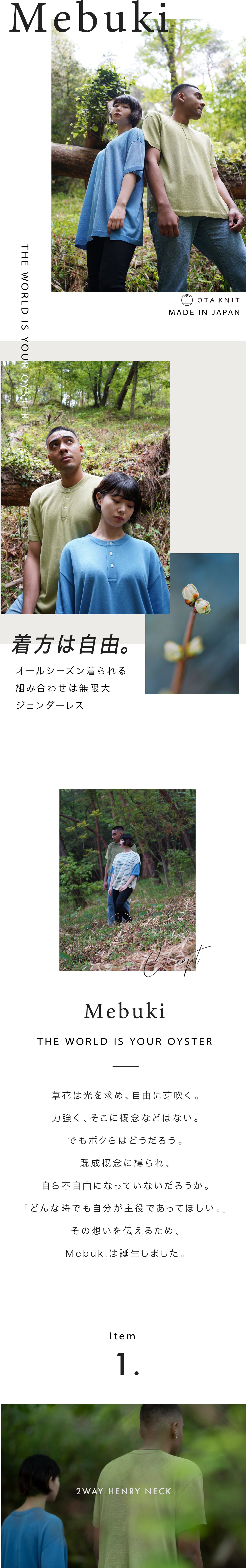 製造元のニット工場の方々、太田市のニット組合の方々や旅でお会いした日本各地の繊維産業の従事者の方々のご協力がなければこのプロジェクトを実施する事ができませんでした。皆様本当にありがとうございます。僕たちはMebukiというブランドを通して、皆様が芽の成長のように自由になることを提案していきます。ここまで読んで頂きありがとうございました。ご支援のほどよろしくお願い致します。