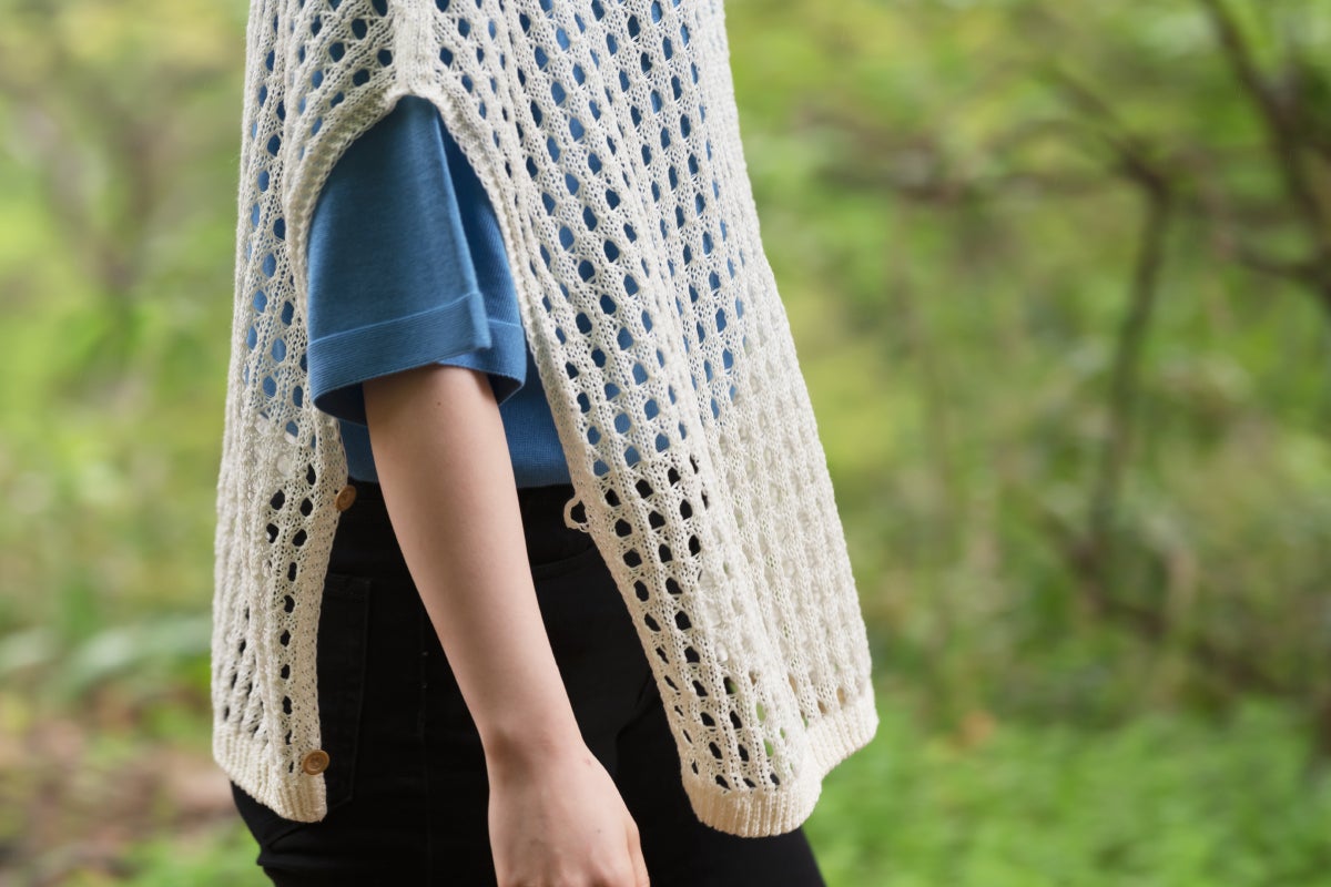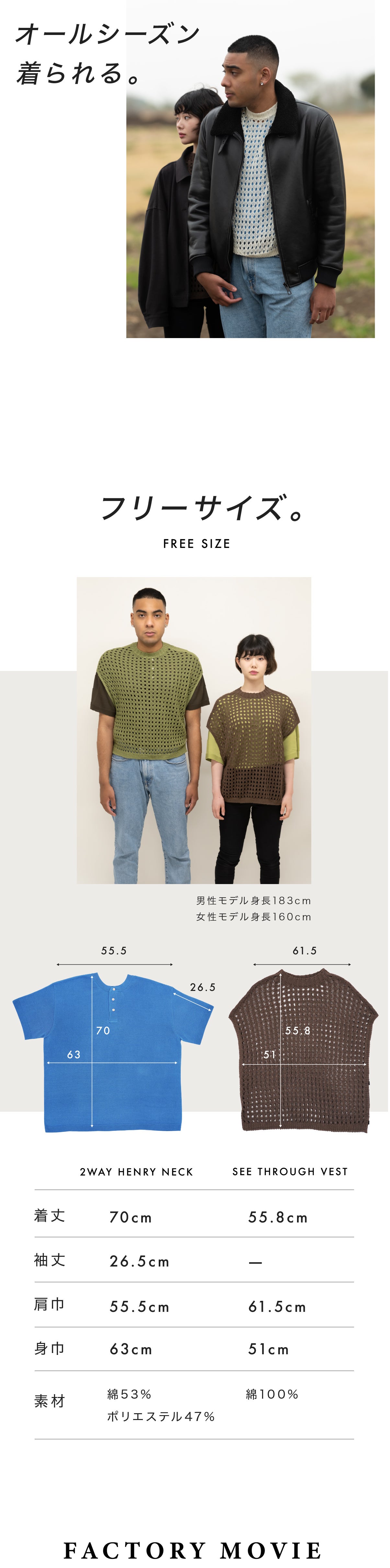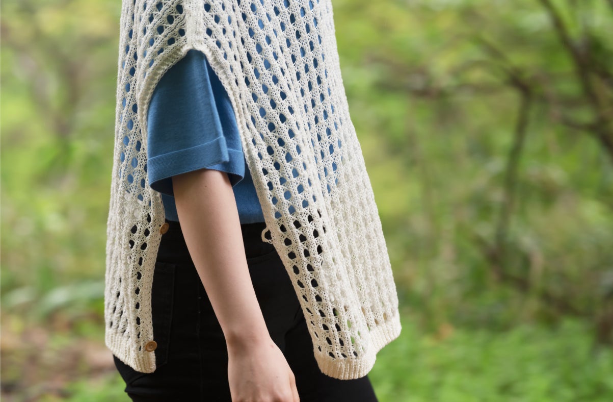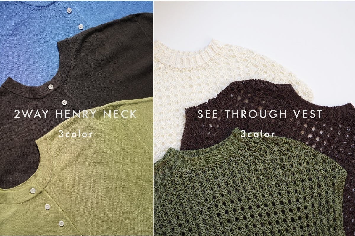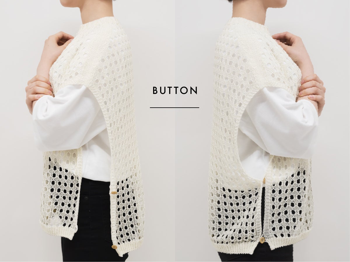透かしベストは軽くしなやか。動くたびに揺れて表情を変えるので、シルエットの変化を楽しめます。サイドボタンを開けたり留めたりすることでコーディネートの幅がさらに広がります。2WAYヘンリーネックとの相性は抜群。