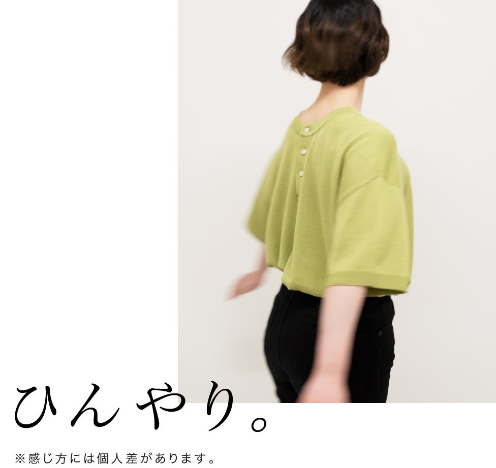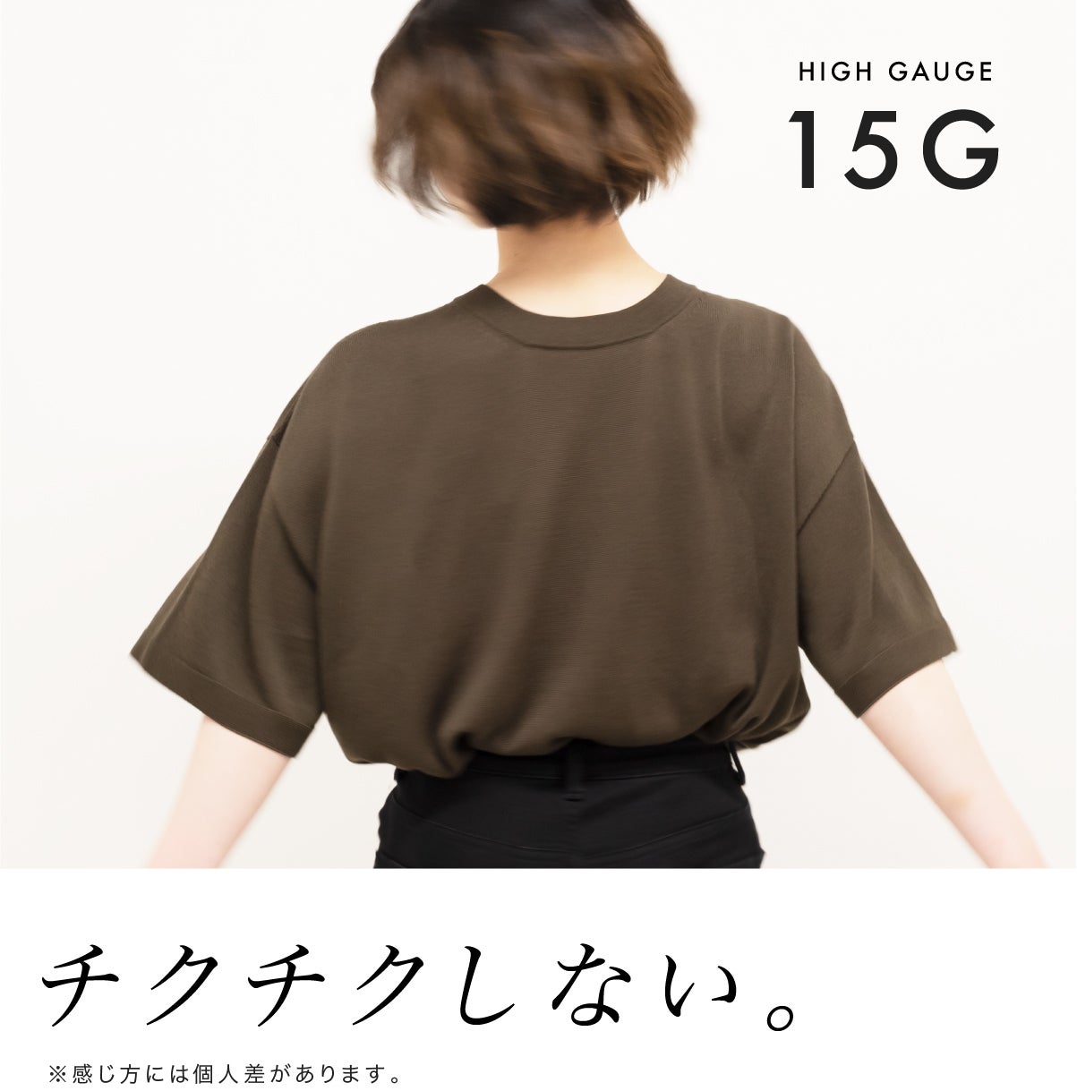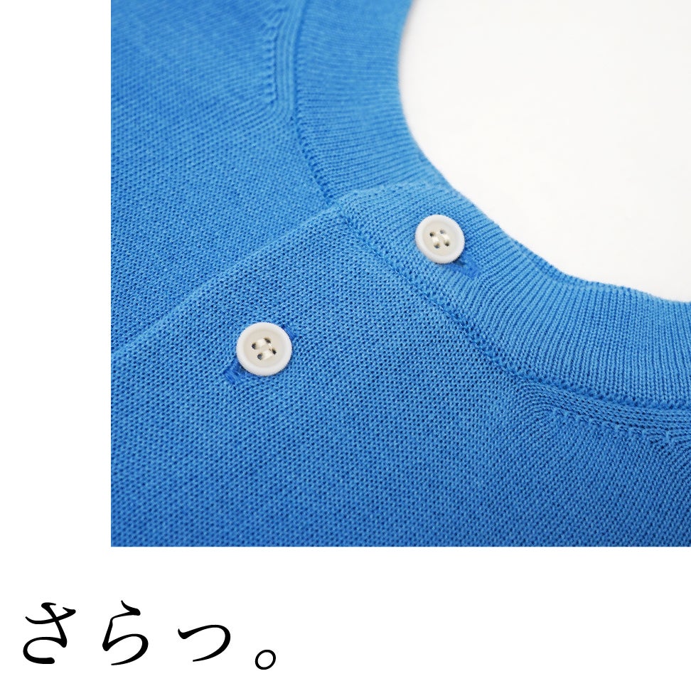 素肌で着たくなる肌心地です。吸水性にも優れているので汗をかいても安心。非常に網目の細かいハイゲージ、15Gのニットを使用。首元がチクチクしにくく、肌が敏感な方でも安心です。