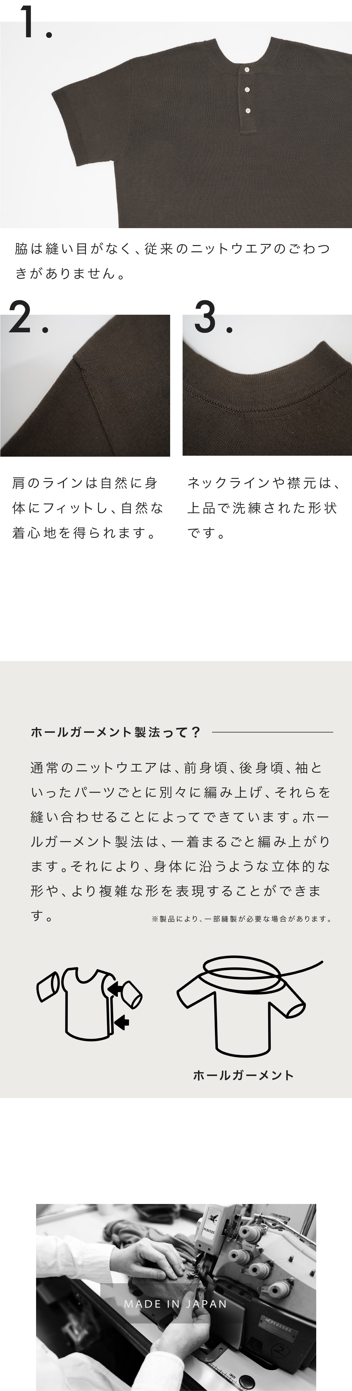 美しいシルエットの秘訣はその製法にありました。一着まるごと編み上げる製法だからこそできる着心地をぜひ体感してください。海外高級ブランドでも採用されている製法です。