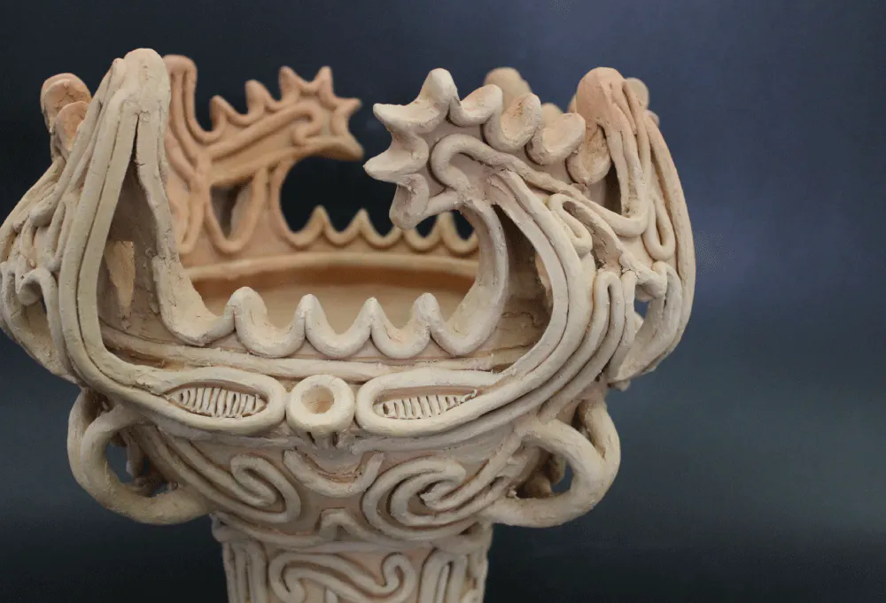 火焔土器を窯に入れる前の無垢の姿です。通常この状態を皆さんが見ることはないのですが、美しいので公開します。まぁ・・柔らかい造形美もいい感じです。