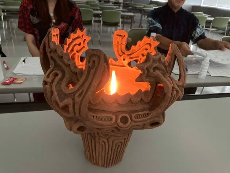 縄文文化の世界遺産登録を思い、みんなで火焔土器に和ろうそくを灯してみました。