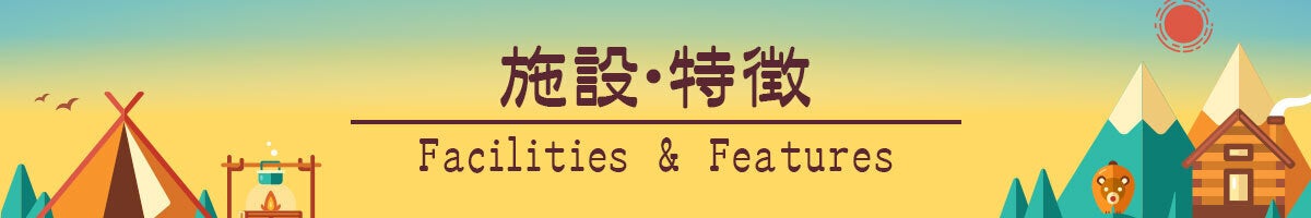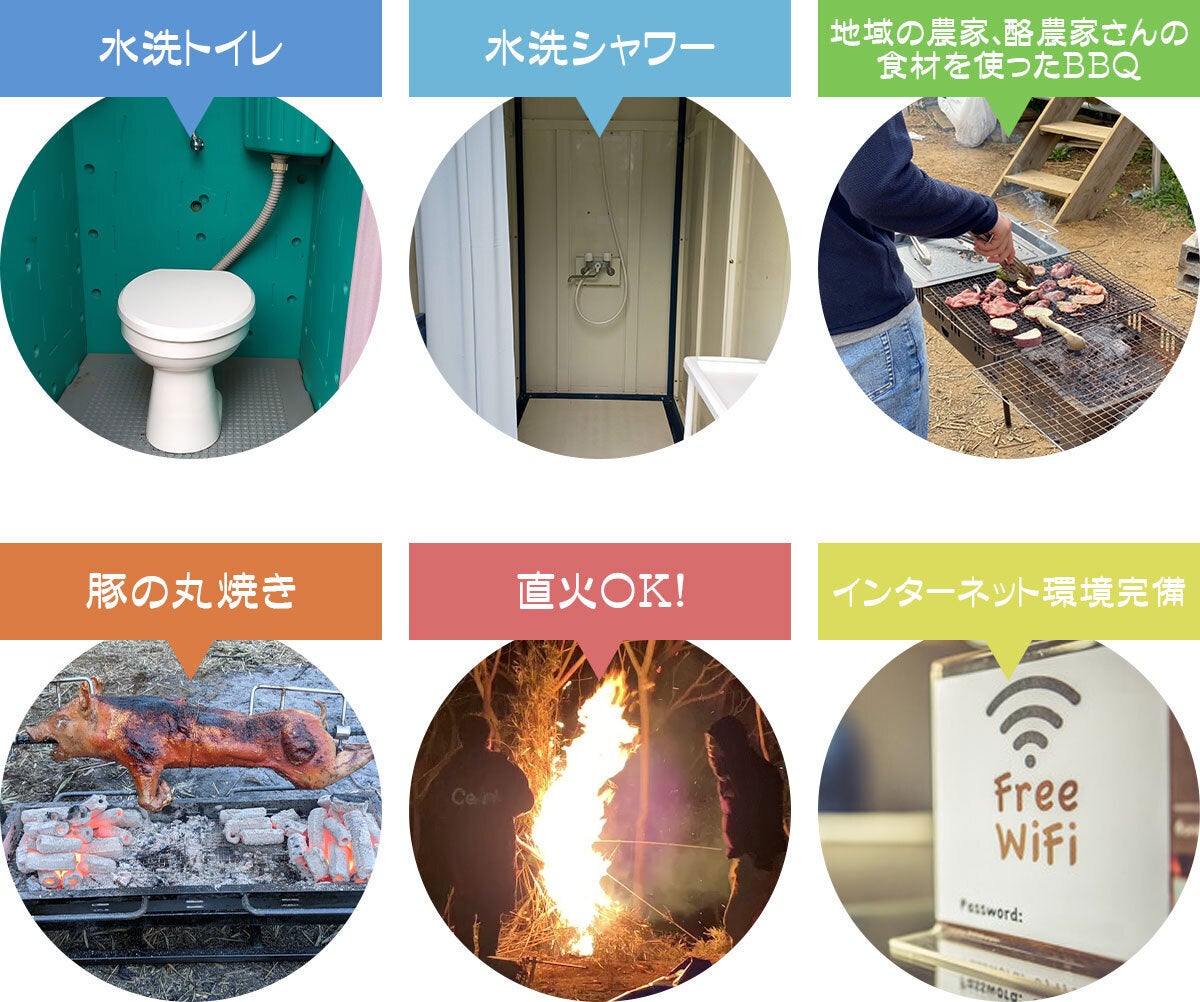 水洗トイレ、シャワー、シンク、寝具、焚き火台、テーブル、イス、ライト、カッセットコンロ、石油ストーブ