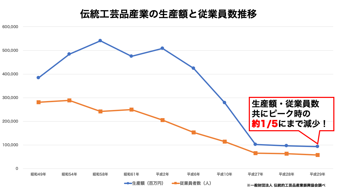伝統工芸品市場は生産額、従業員数共になんとピーク時の1/5にまで減少してしまっています。