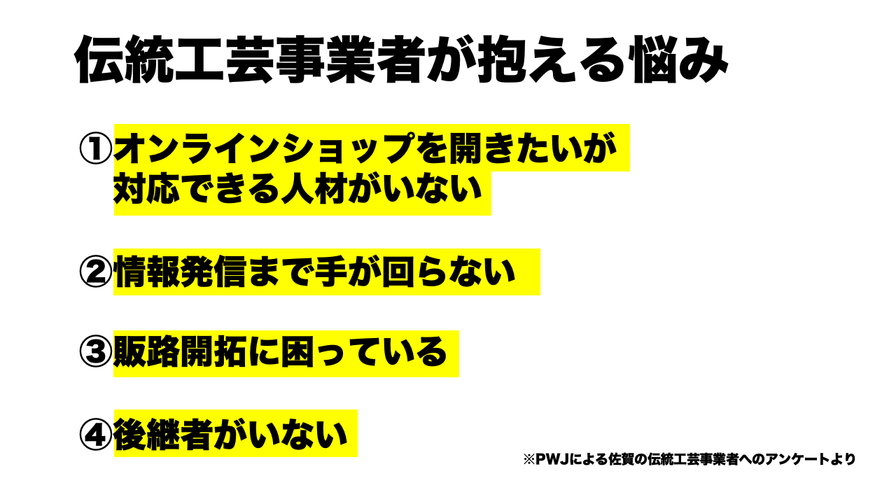 私たちは、これまで5年間にわたって伝統工芸支援活動に取り組んできました。その中で、「売上の減少」「オンライン化への対応」「後継者問題」などについて多くの伝統工芸事業者さんが悩みを抱えていることを知りました。