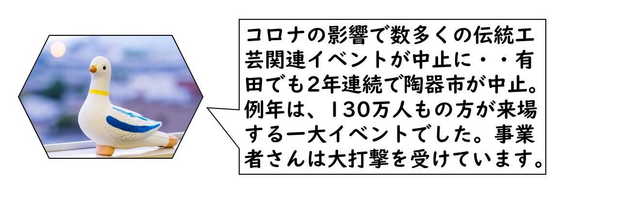 コロナ禍では、伊万里焼の産地、大川内への客足が激減し、店舗での売上は大きく減少しました。飲食店・宿泊施設の需要減、各種展示会の自粛・中止など大変厳しい状況が続いています。