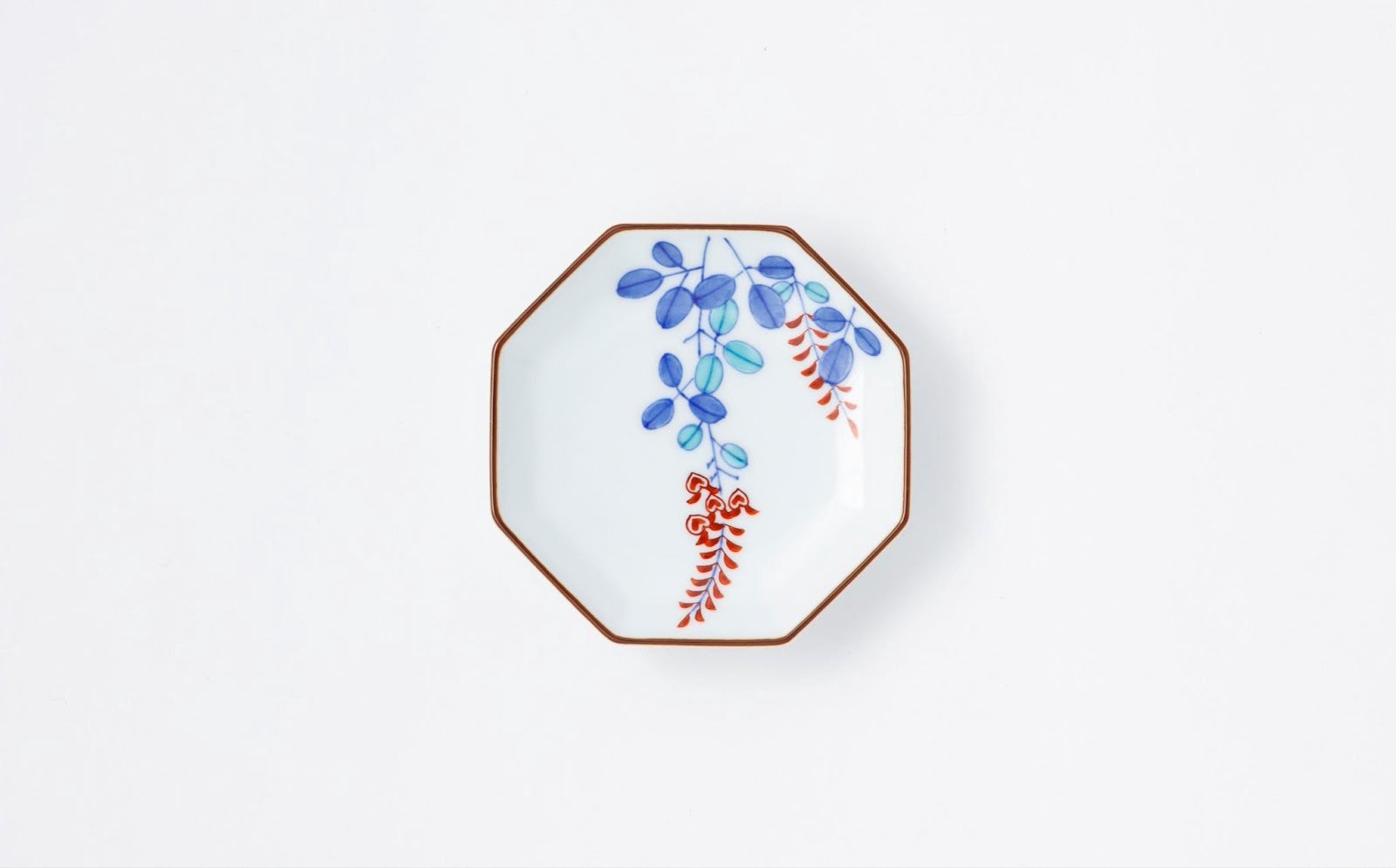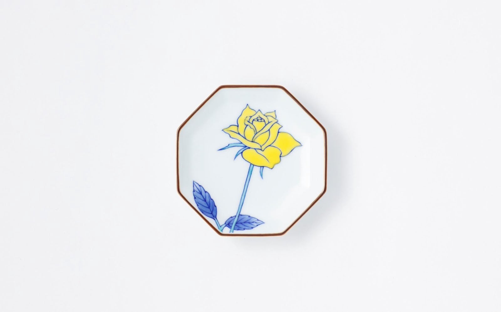 エレガントな八角形の小皿に黄色の薔薇が繊細に描かれています。