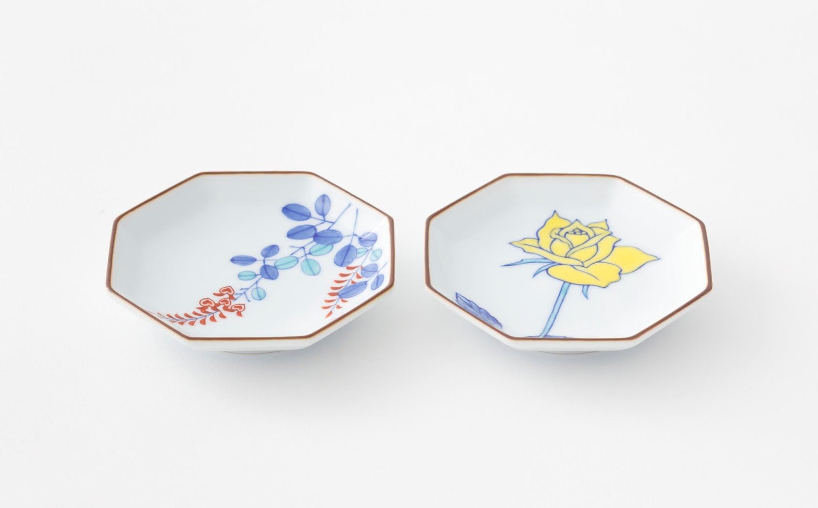 ①有田焼/辻常陸窯/染錦薔薇紋小皿、染錦萩紋小皿