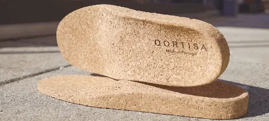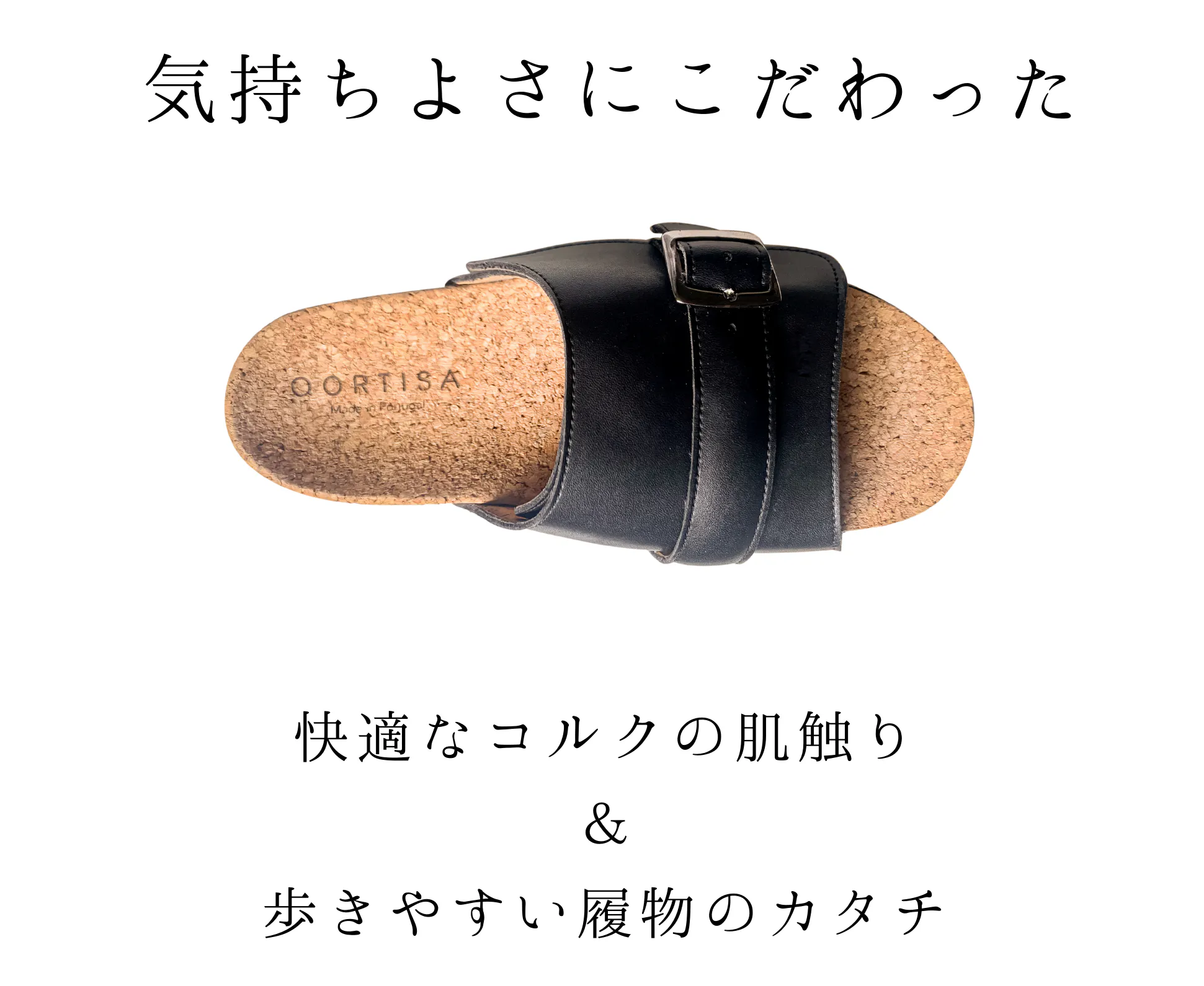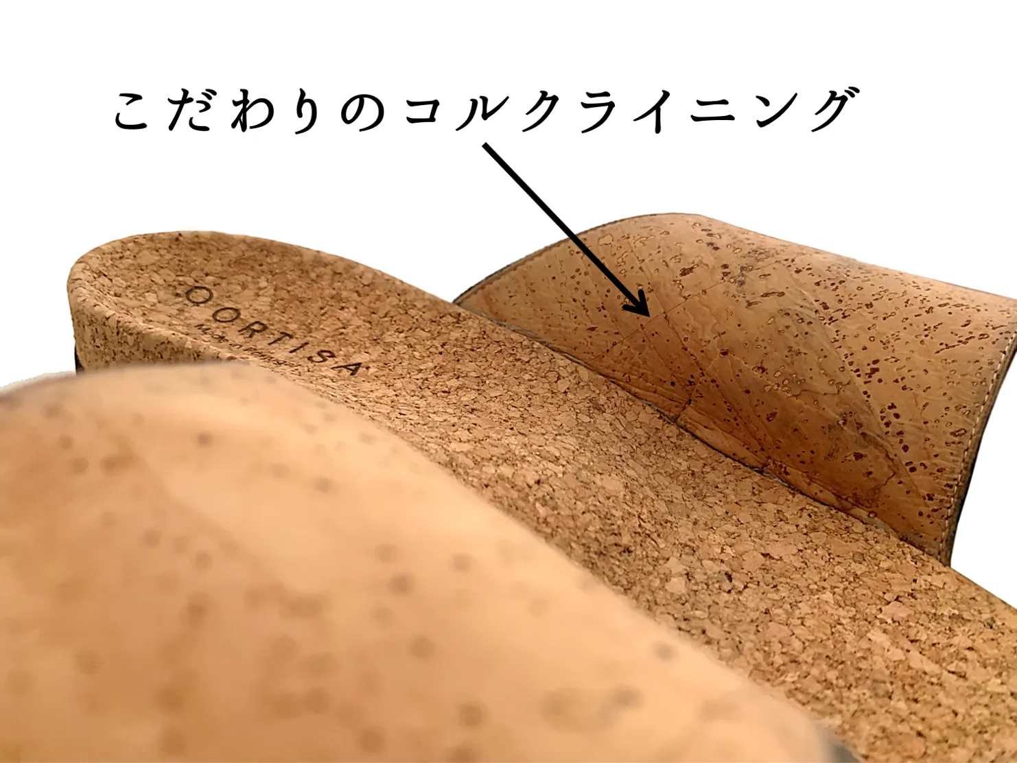 コルクを使用してソールを作る場合、一般的には多くのラバーを混ぜるので、コルクの特性が損なわれてしまいます。QORTISAは圧縮加工技術により接着剤の使用を最小限にとどめ、「軽さ」や「肌触りの良さ」といったコルクの特性を十分に引き出しました。 更にインソールは、革や布を貼らずに仕上げているため、コルク特有のサラっとした心地よい肌触りを、ダイレクトに感じていただけます。
