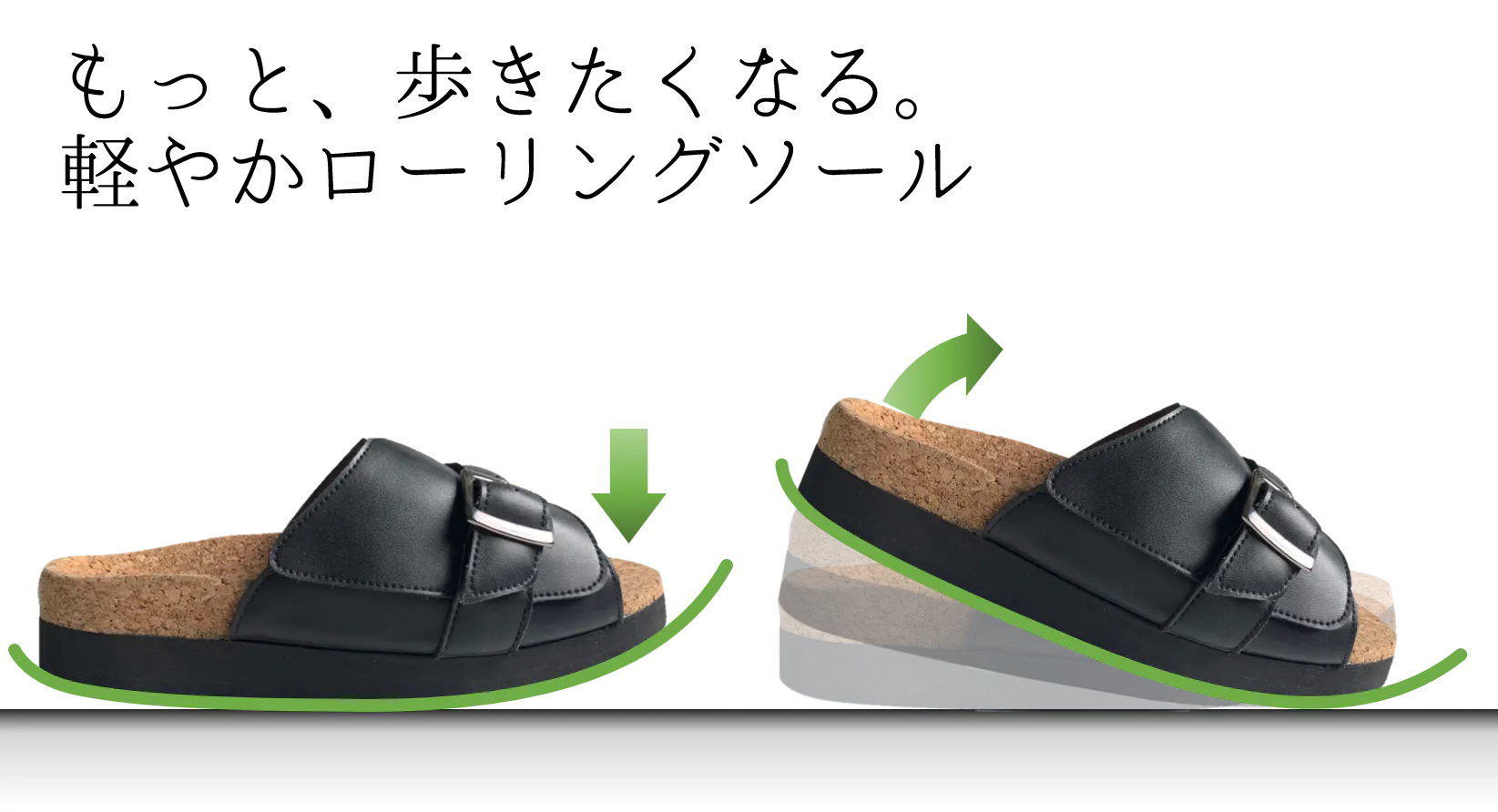 歩きやすさを考えて、つま先をローリング形状にしました。つま先に荷重をかけるだけで、自然に足が前に運びます。緩やかな下り坂を歩いているよな感覚に、「もっと、歩いていたい。」と思うはずです。また、ローリング系のシューズにありがちな不安定感がないよう、接地面積は広めにとってます。