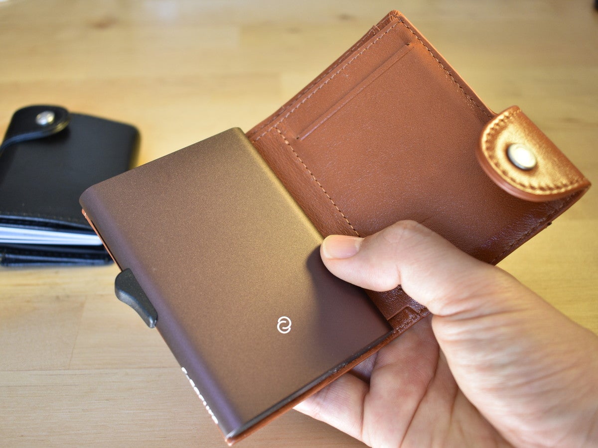 アルミニウム製のカードケースとバケッタ製法で作られたベジタブルタンニンレザーが滑らかに融合したデザインです。