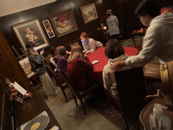 イマーシブ(immersive)とは「没入型の」の訳で、仮想空間でありながらまるで現実空間に入り込んだ印象を与えることを意味します。固定された座席などはなく、お客様が建物内を自由に歩いてお楽しみいただけます。お客様を一演者として捉えた演出をし、役者がお客様とコミュニケーションをとってきたりします。