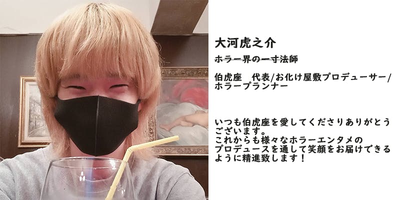 関西ホラーエンターテイメント集団伯虎座 代表の大河虎之介(たいがとらのすけ)です。