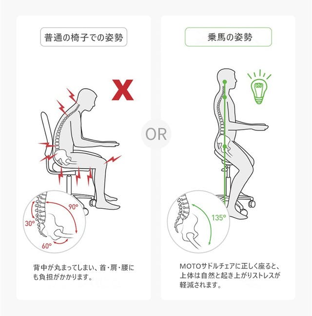 そこで「MOTO」は骨盤が軽く前傾し、背骨がスッと立った座り姿勢とりやすいようサポートします。